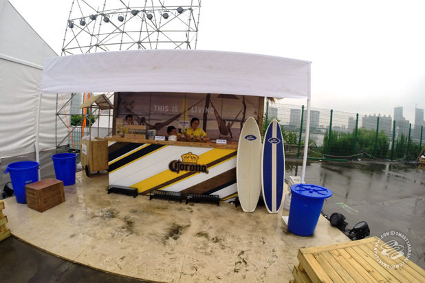 10rmb water bottles. 40rmb Coronas. Straight-up weapons grade burgers, hot dogs, BBQ, wraps from 30rmb. It's all provided by a restaurant called "Soccer Fans". What?