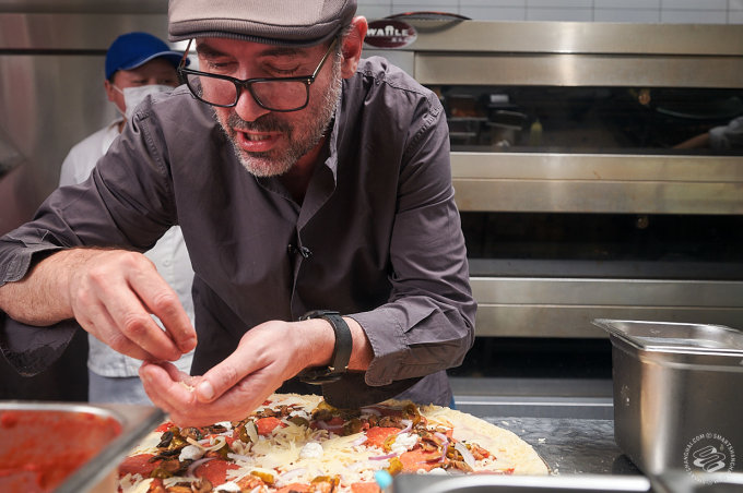 For the next thirty minutes, Pairet expounded on, of course, pizza, why Marseilles was once the world capital of pizza (as he said in the accompanying Industry Nights article), the proper concentric distribution of toppings, Homeslice's method for applying cream and much more, while stretching the dough, piling on toppings (every kind of cheese in the place) and sliding the pie into and out of the oven.