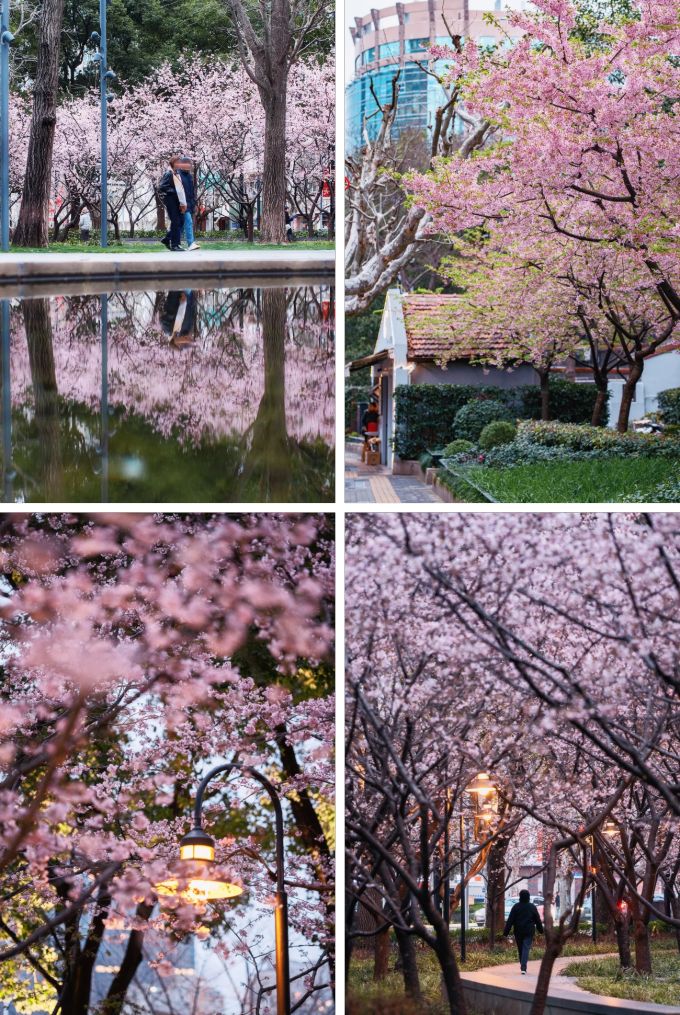 Right in the city center, Jing'an Sculpture Park is a convenient option if trekking out to the big parks feels like too much effort. The early cherry blossoms here usually start appearing in late February, with a small grove and a narrow sakura path in the park's southwest corner. Come around dusk, the path lights up in soft blue evening lighting, which gives the blossoms a surprisingly atmospheric look.