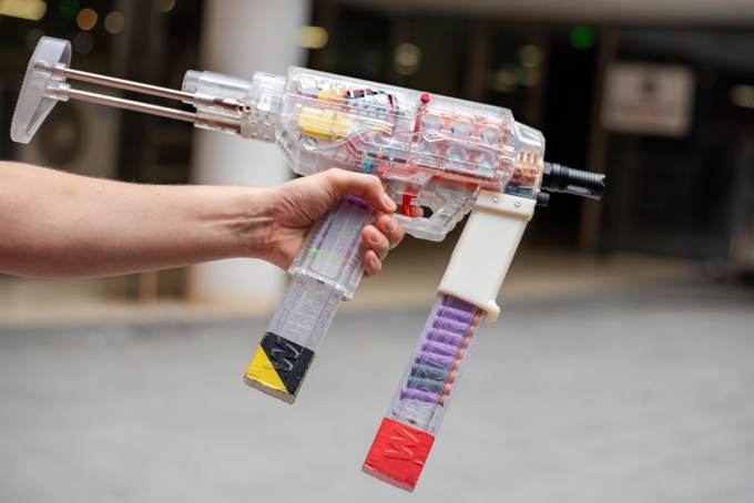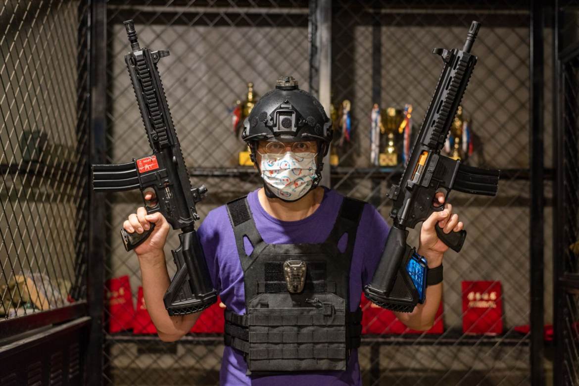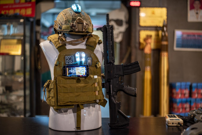 Another is a realistic looking AR-15 sort of gun with hit-detectors on the torso and helmet. Very Black Hawk Down. Drawback is they have to be linked to a finicky app on a phone they strap to your forearm.