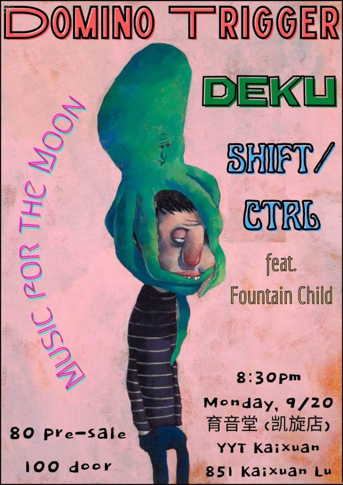 Concert at Yuyintang (Kaixuan) on September 20, with the Dominic Trigger, Deku, Shift/Ctrl, and Fountain Child. Dominic Trigger is a Shanghai formed, art-punk trio that blends noise rock, post-punk, and experimental music to reflect upon the contemporary era. Deku released their debut album It's Dangerous to Go Alone in December 2020, featuring forward-driving, indie rock grooves that incorporate different styles and beats. Shift/Ctrl's progressive hard rock also mixes punk, funk, and grunge and metal with members Xu, Makoto, and Rod. Fountain Child will also be a featuring act. Tickets can be purchased through their mini-program (go into their calendar); presale tickets are 80rmb or buy at the door for 100rmb.