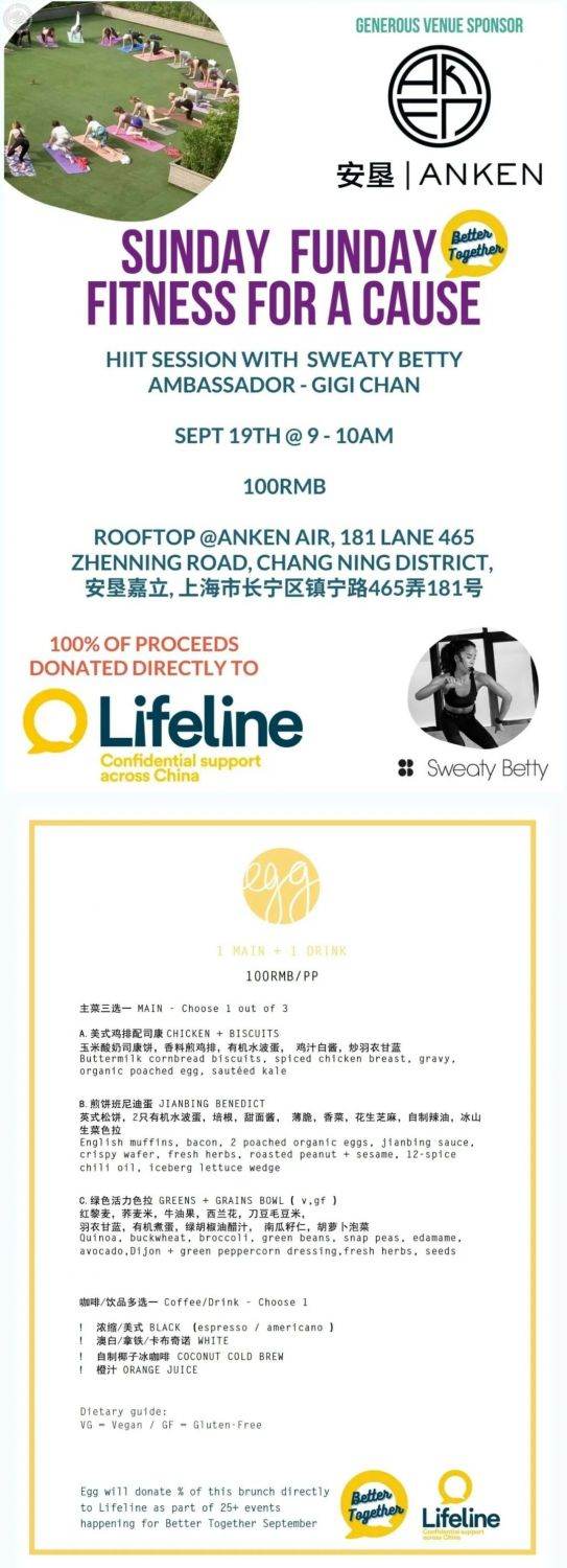 Join a HiiT workout with Gigi Chan on September 19 from 9am, suitable for people of all levels. Spots are 100rmb per person, with donations to Lifeline. Limited seats, scan the QR code in the flyer to book. A choice of set menu for 100rmb for 1 main and 1 drink from Egg.