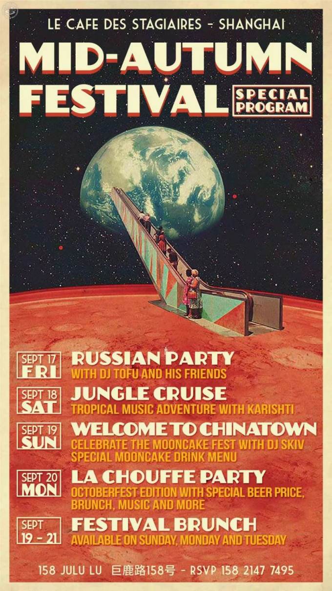 For those staying in town this Mid-Autumn Festival, Le Cafe de Stagiaires is hosting a fun-filled 5 days of party. Events include a Russian Party featuring DJ Tofu, Jungle Cruise-themed night with tropical music, 3 days of festival brunch, and more.