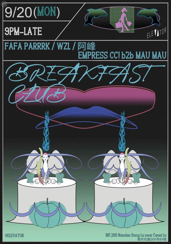 Breakfast Club brings together shades of deeper dance music with rising Beijing talent Fafa Parrrk who has been smashing sets at Wigwam and Zhao Dai, together with a DJ set from WZL, the alter ego of Chengdu artist 吴桌玲。Support comes from Elevator music director and Medusa resident Mau Mau b2b with Schwarz's Empress CC!, with warmup duties from 啊峰. Arrive before 1 to get free breakfast with the artists at the end of the party. 80rmb entry.