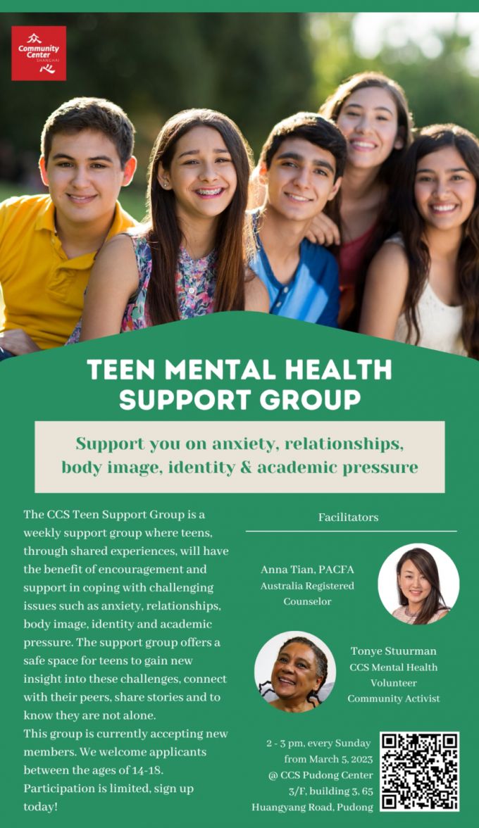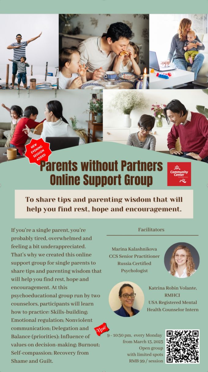 Flora Wang: In addition to one-on-on counseling, Community Center Shanghai Counseling also offers support groups this Spring. These groups will provide an opportunity for community members to connect with each other on a deep, meaningful level and to share, encourage, and support each other through common struggles and issues.