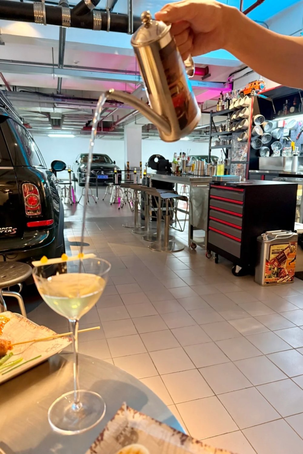 Eventually, you land where you started heading: B1 of the Peninsula, inside an industrial-style space dressed up with car parts and garage ephemera. It's less speakeasy, more staged experience the kind of place designed to be talked about as much as drunk in.