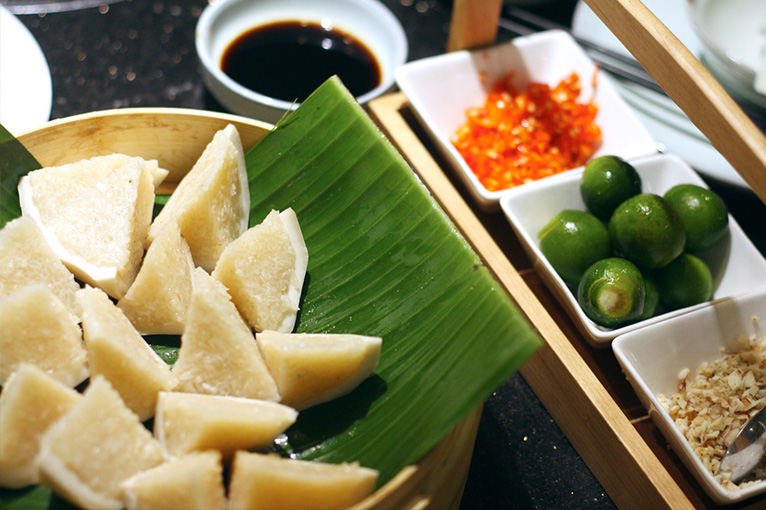 So you get this flat-bottomed shallow pot on your table to start. There’s an induction in the middle. Standard 21st century hot pot. Except in the pan, there is only clear coconut water and strips of white coconut. One of the Singaporeans said it looked too clear to be just coconut water and must be diluted, but you can and should taste it straight from the pot when it comes to the table. There’s no raw chicken in it or anything. Coconut water and coconut. It’s sweet, tropical and a touch salty.
