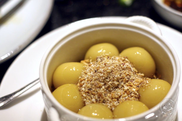 One of the other specialties here is sticky rice that has been steamed inside a coconut (I suspect with a measure of coconut milk but didn’t ask), cooled slightly, and then the coconut is split into quarters. This is nice. Like a coconut flavored zongzi (no meat). Another is dessert, which is a small bowl of glistening mochi, as shiny and perfectly round as egg yolks, covered in a topping of crushed peanuts, dried coconut and sugar.
