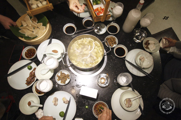 So thinking coconut and hot pot, I invited a group of Singaporeans along. Maybe they’d had something like this before. They would know how to skewer it. It turns out they don’t have coconut hot pot in Singapore. So much for that idea. Coconut hot pot, if it’s a real thing and not a newly created dish, is from Hainan, we learn via the menu. But among my Singaporean table, there was more than one architect, and they quickly pointed out how many of the restaurant’s features were the same as Liquid Laundry: the subway tiles, the "reclaimed" wood, the painted chains hanging from the ceiling. Also, the ceiling ductwork is well done, apparently.
