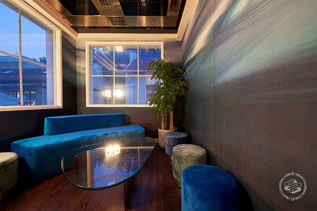 The third floor is a three-room setup with its own bar, and a corner for the DJ. The seating is low, and the lights are lower.