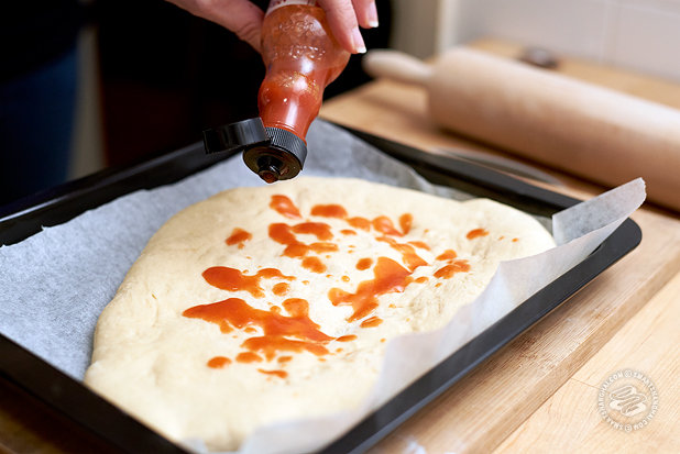 1. Take about 3-4 Tablespoons of the buffalo sauce and spread it over the pre-baked crust.