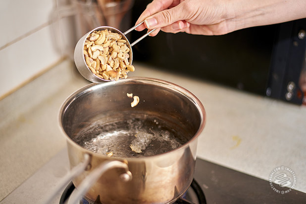 1. Add the cashews to a small pot and with enough water to cover the cashews, plus a bit extra. Bring to a boil and cook for 10 to 15 minutes until they are softened. Alternatively, you can soak them overnight.