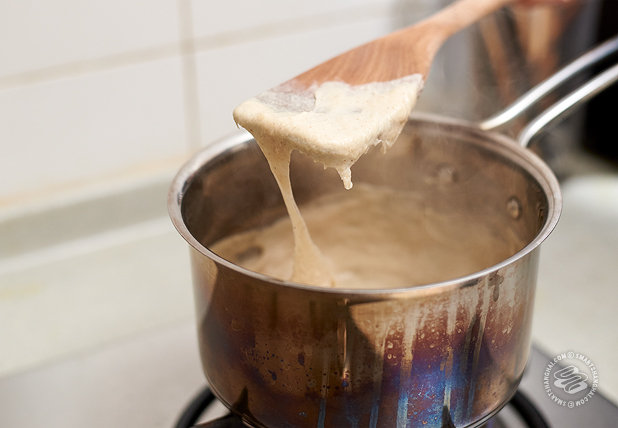 4. Pour mixture into a small pot and heat over medium-high heat, and stirring continually as it cooks. Clumps will begin to form, and after a few more minutes a smooth paste will form. Cook for about one more minute. It should look like melted cheese when you raise the stirring spoon.