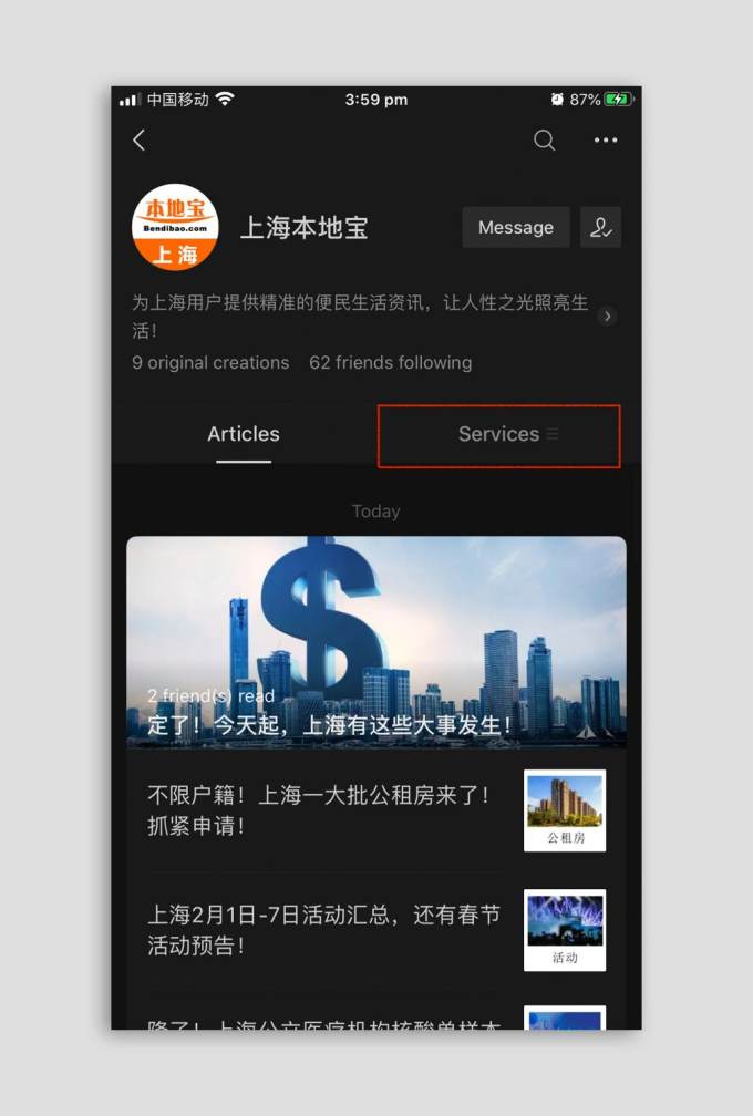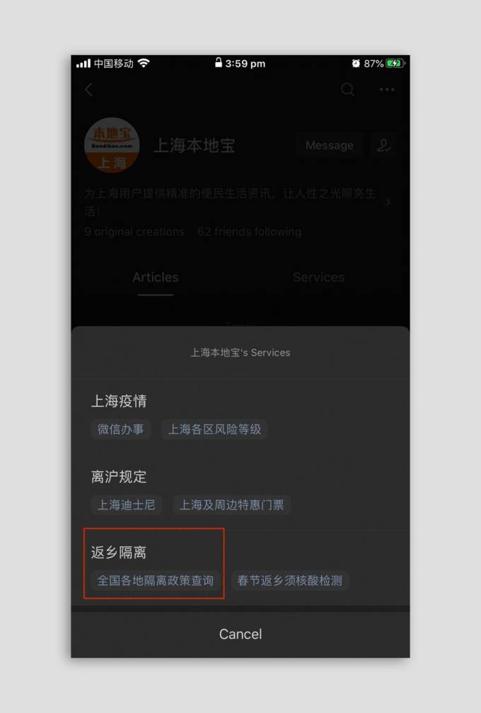 After finding the account, open up the Services menu and click on 全国各地隔离政策查询 (quán guó gè dì gé lí zhèng cè chá xún). It will redirect you to a page on their website.