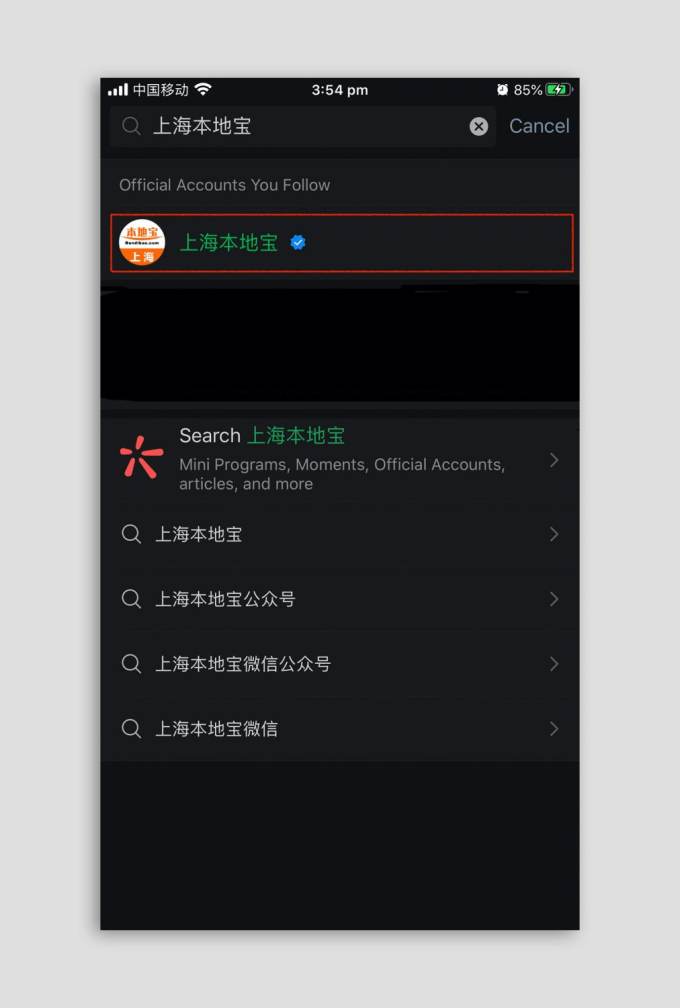 The first thing to do is find the account of 上海本地宝 (shàng hǎi běn dì bǎo). Type in the pīnyīn (or characters, if you can) into the search bar and click on this name.