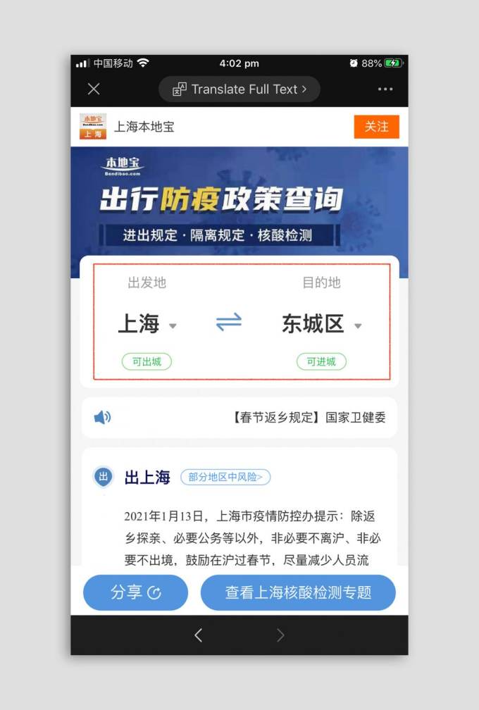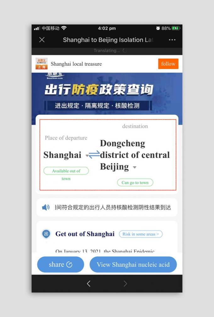 Now users can input a leaving location, with or without districts, and then choose the desired location. At the bottom of the cities' names is a text box defining the level of risk. Scrolling further down the page will reveal the government regulations for the cities. If the Mandarin is troubling, know that WeChat has incorporated a translation add-on. Just click at the top of the page and everything will be translated into English.