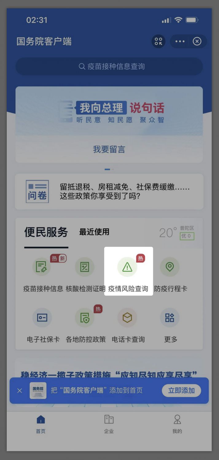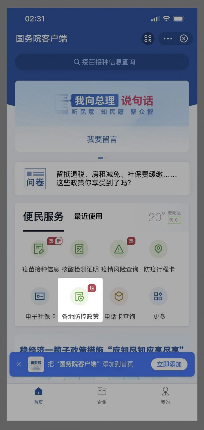 3. Then, we need to go back to the home page, and select "各地防控政策" to search for the latest policy.