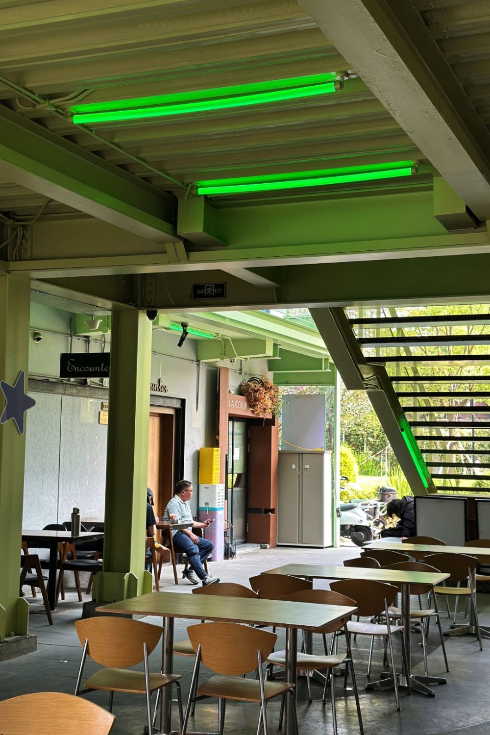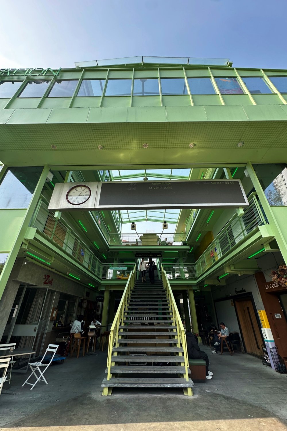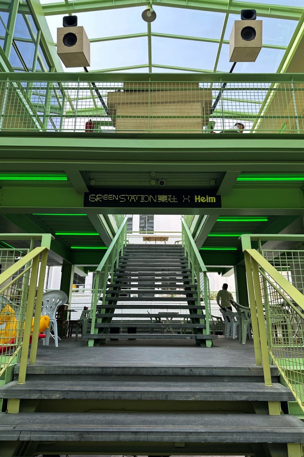 Just off Changle Lu, a small creative compound longtime Shanghai wanderers might remember has quietly resurfaced with a new look. Now called Green Station, the space first opened in 2016 as United Valley — three standalone buildings stitched together with platforms, staircases, and steel walkways. Earlier this year, it got a light refresh: nothing structural, just a repaint and subtle tweaks. The steel framework is now a soft mint green, shifting the mood from industrial bunker to something brighter and more relaxed.