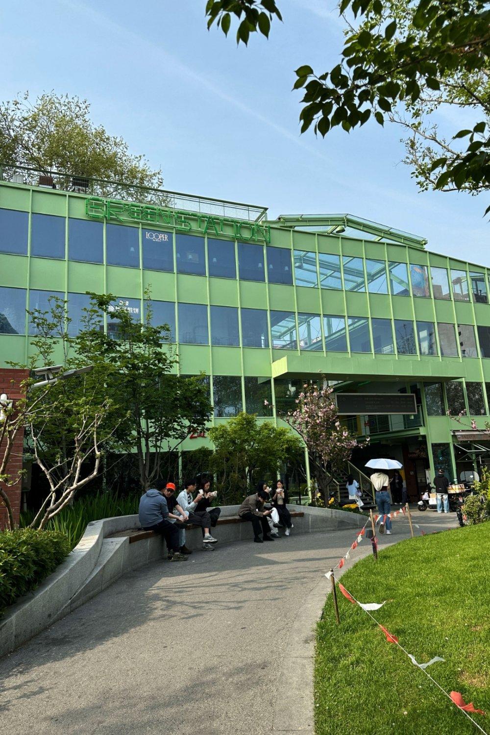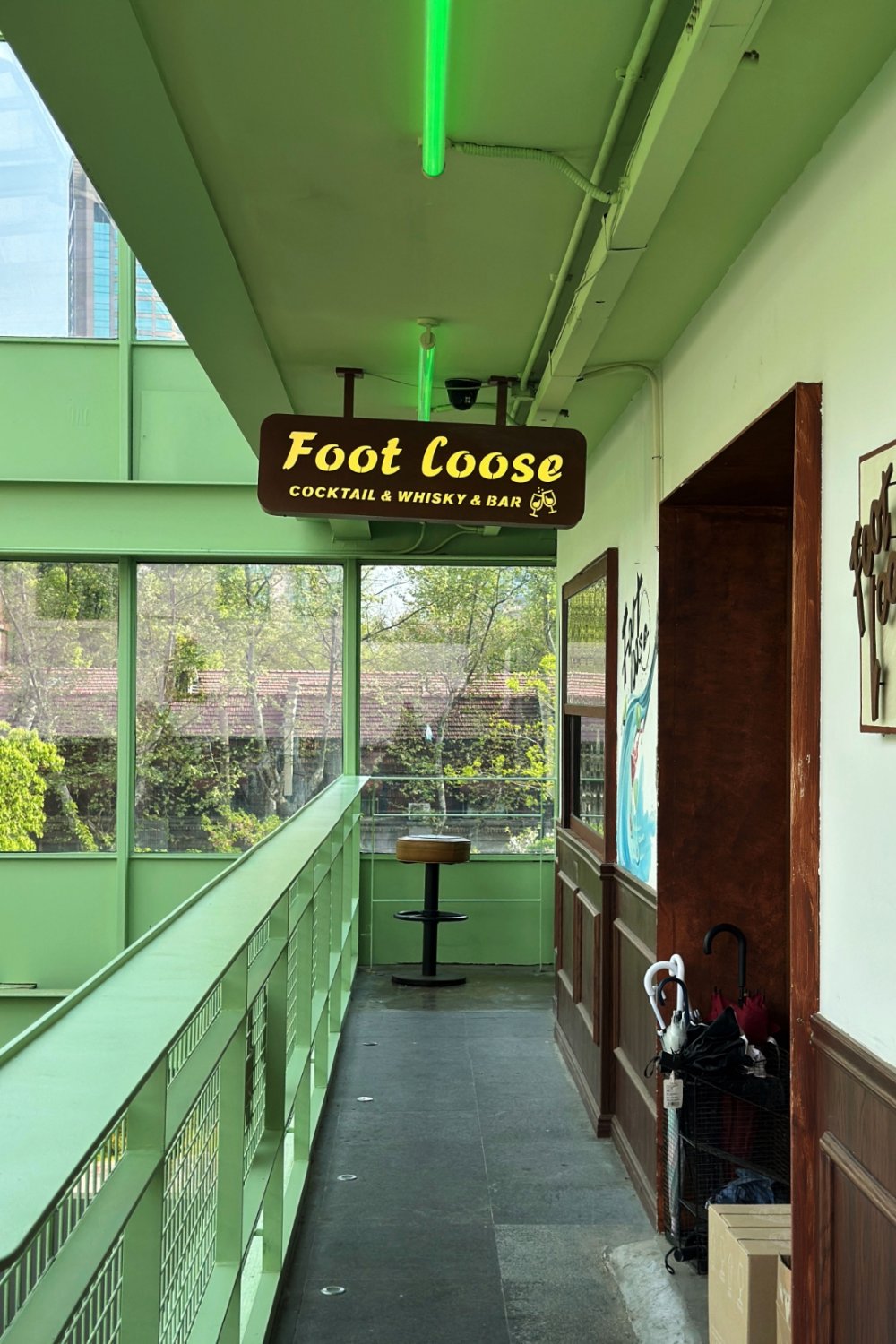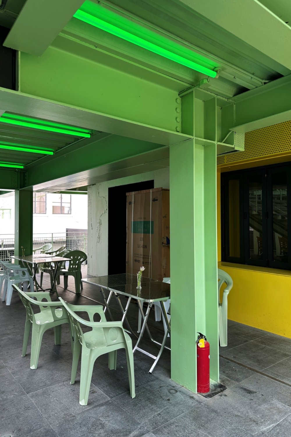Just off Changle Lu, a small creative compound longtime Shanghai wanderers might remember has quietly resurfaced with a new look. Now called Green Station, the space first opened in 2016 as United Valley — three standalone buildings stitched together with platforms, staircases, and steel walkways. Earlier this year, it got a light refresh: nothing structural, just a repaint and subtle tweaks. The steel framework is now a soft mint green, shifting the mood from industrial bunker to something brighter and more relaxed.