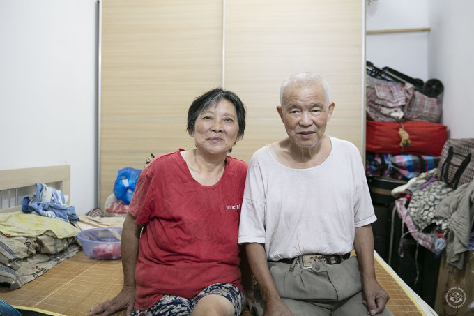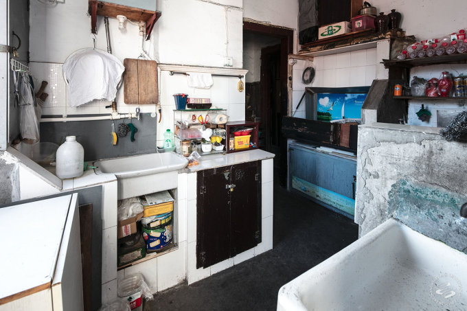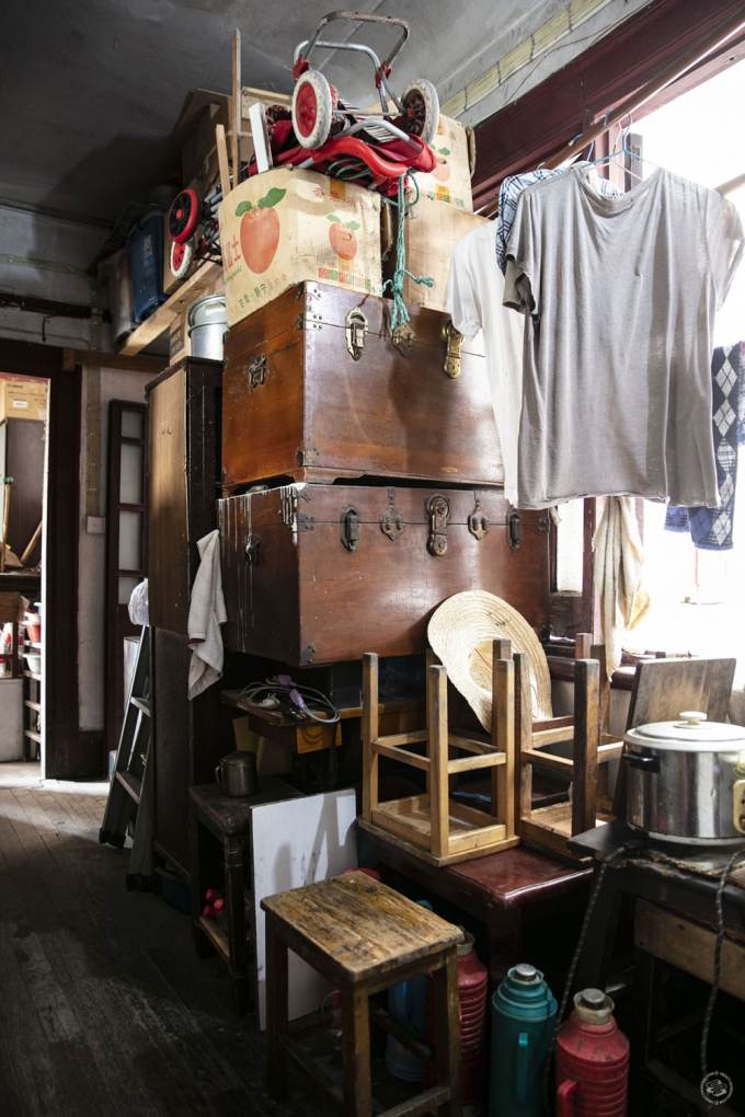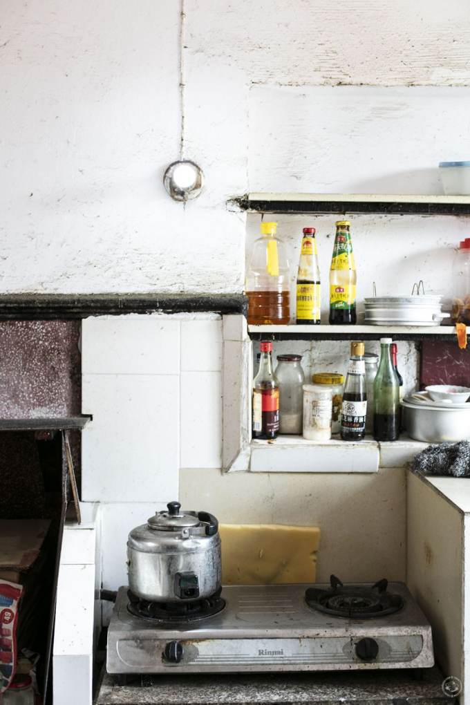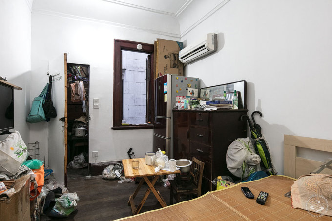 Yang Changgen and his wife Li Zhifang live on third floor of the Ramous Apartments (built 1928) in Hongkou. Their 20 square meter apartment shares a kitchen with their neighbors, and hallways are cluttered with bicycles, suitcases and boxes.