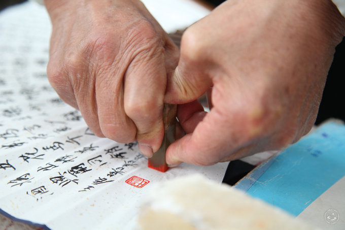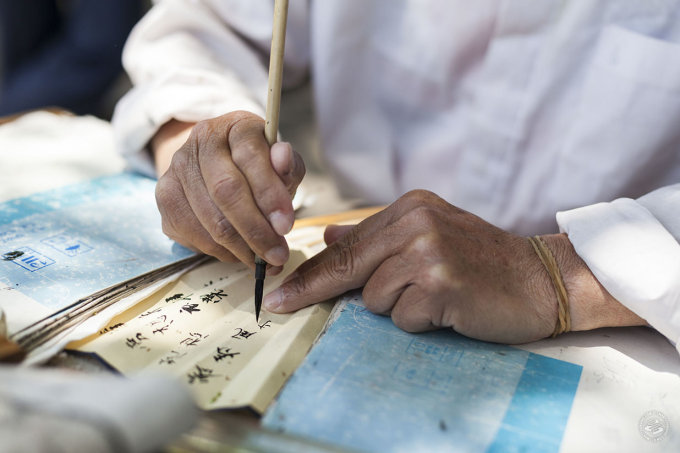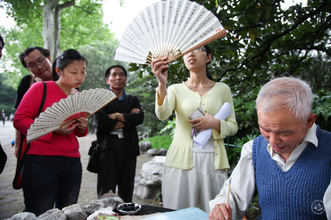 “I wake up at 5:30 in the morning, pick up the table and stools, put them in the trolley and walk to Luxun Park, where I stay until about five in the afternoon, drawing calligraphy on my fans and selling them.