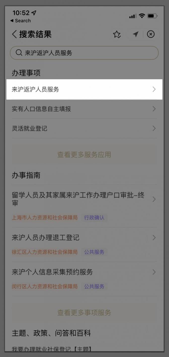 3) Then search for 来沪返沪人员服务 and open the first result
