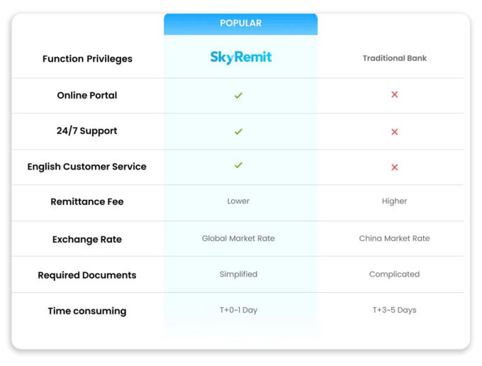 Compared to traditional banks, SkyRemit offers several advantages: no offline queuing, a simple documentation process, user-centered operation, low fees, and speedy transfer times. With SkyRemit,you can say goodbye to hassles of dealing with banks directly.