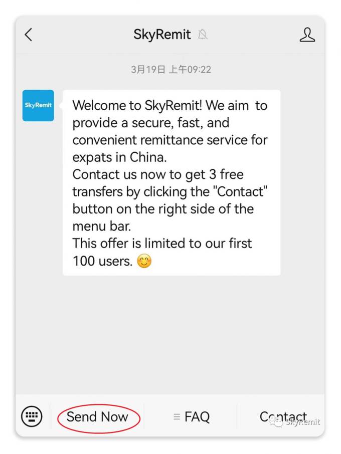 Using SkyRemit is incredibly easy. Simply follow our official WeChat channel and click the "Send Now" button located in the bottom left corner of the menu. If you have any questions or concerns, just click "Contact" and our customer service team will be happy to assist you with any issues you may have.