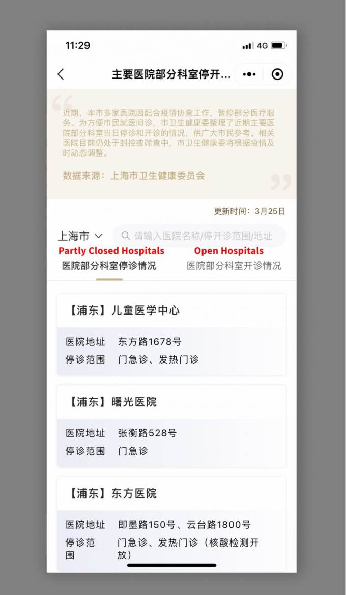 A bunch of hospitals are currently closed, including all of Parkway Clinics locations and Jiahui Hospital's main campus (as of March 26). The case of a nurse that has died after not having received timely help due to a local hospital being closed has made waves, and the Shanghai government responded acknowledging that better procedures might have to be implemented to make sure hospitals don't have to close down for an unnecessary amount of time. Just this morning they announced that less hospital closures are to be expected now. If you need to visit a hospital, we recommend you call the city's hotline 12345 to verify that the hospital of your choice is currently open. Another way is to check in WeChat's MiniProgram. Search for "随申办" or click below, then follow the steps on the pictures.