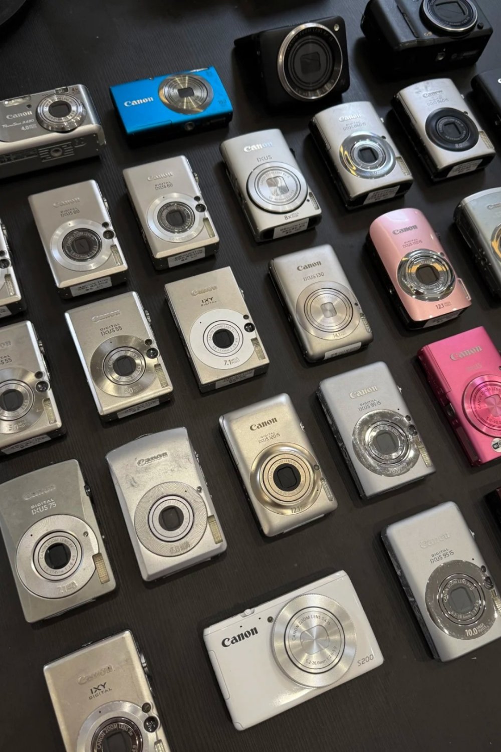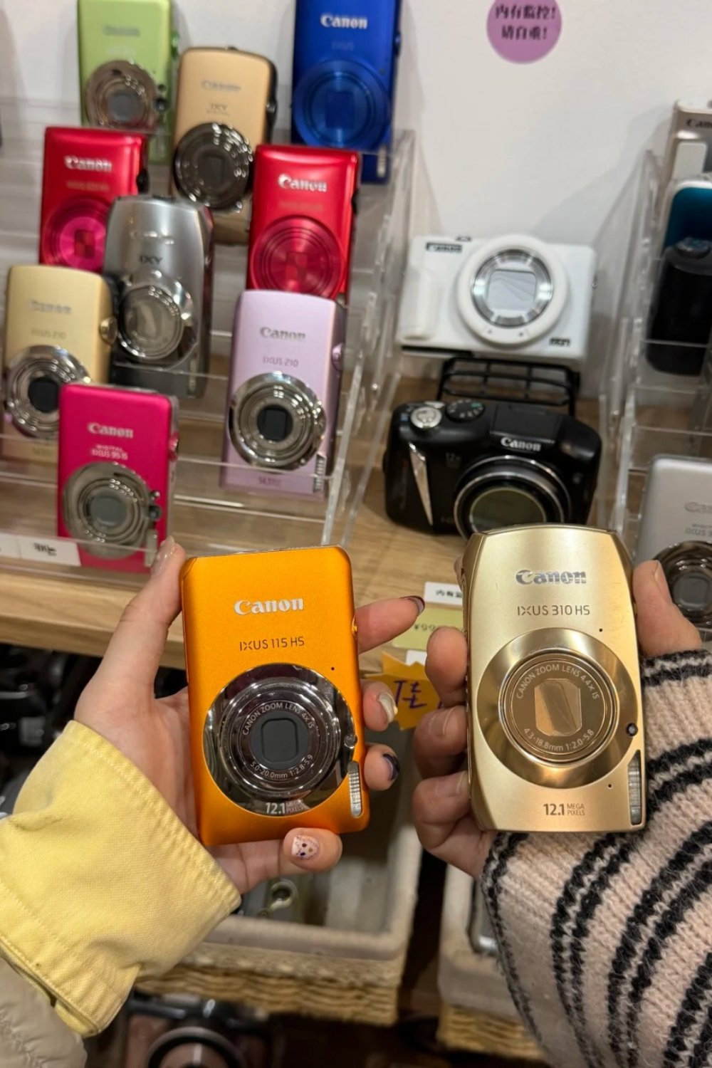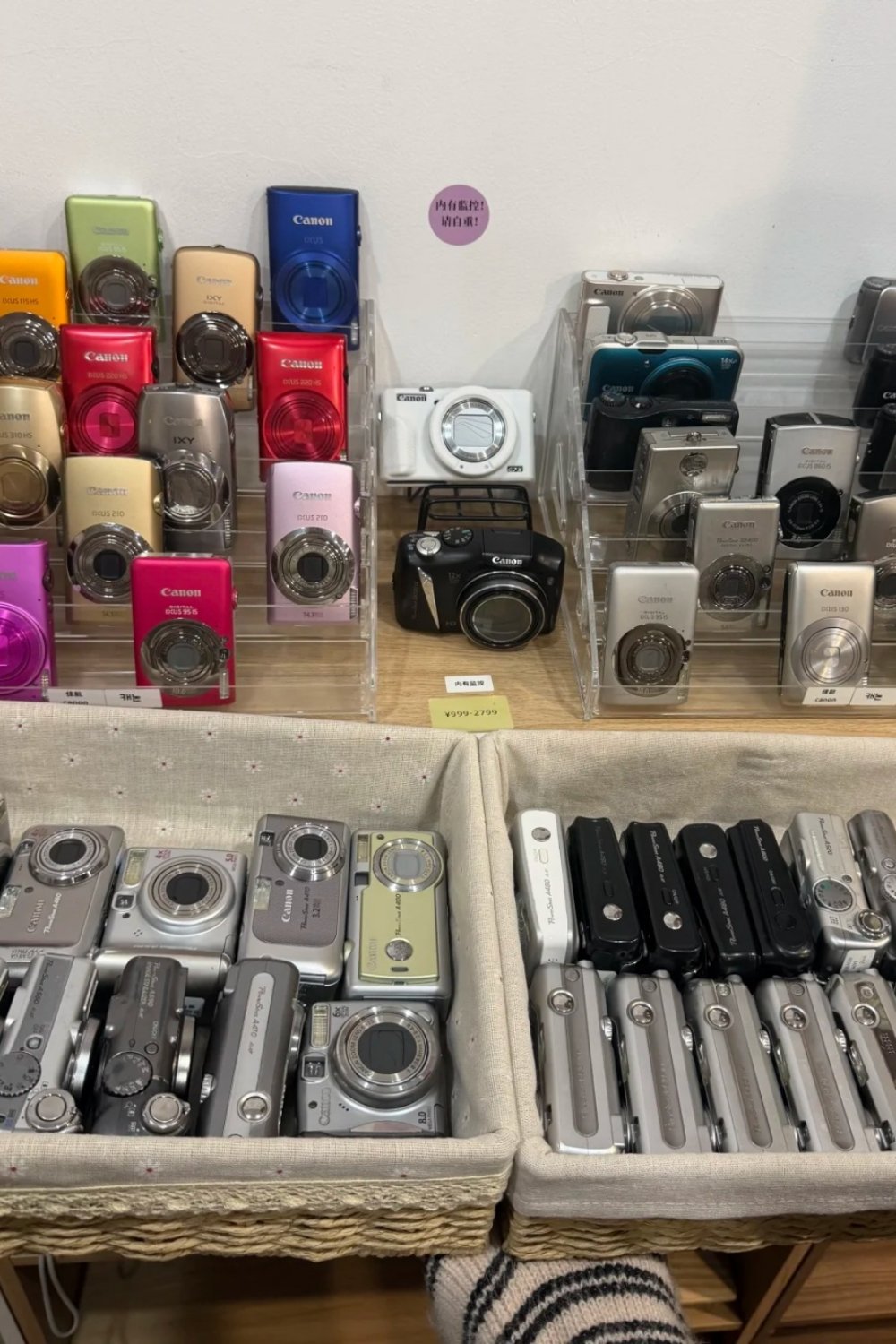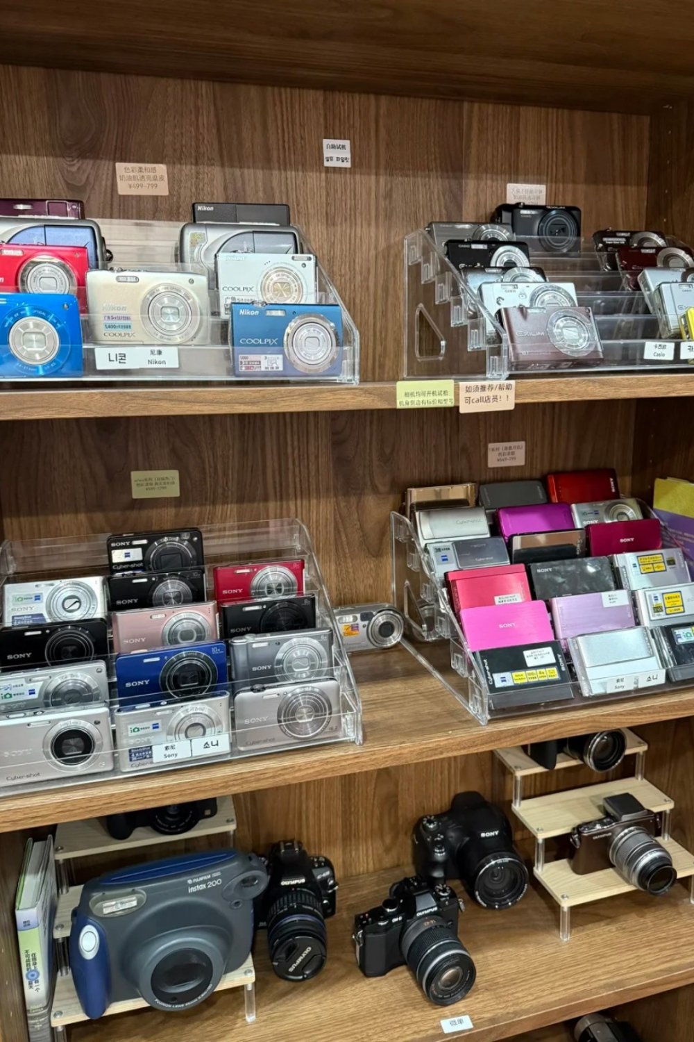 Most of the gear is second-hand: Canon, Fujifilm, Sony, Panasonic, Samsung, Casio, Nikon, Olympus. Expect plenty of Canon IXUS models, along with A-series compacts and long-zoom SX cameras. Instant cameras, film cameras, and even the occasional DV camcorder are mixed into the shelves.