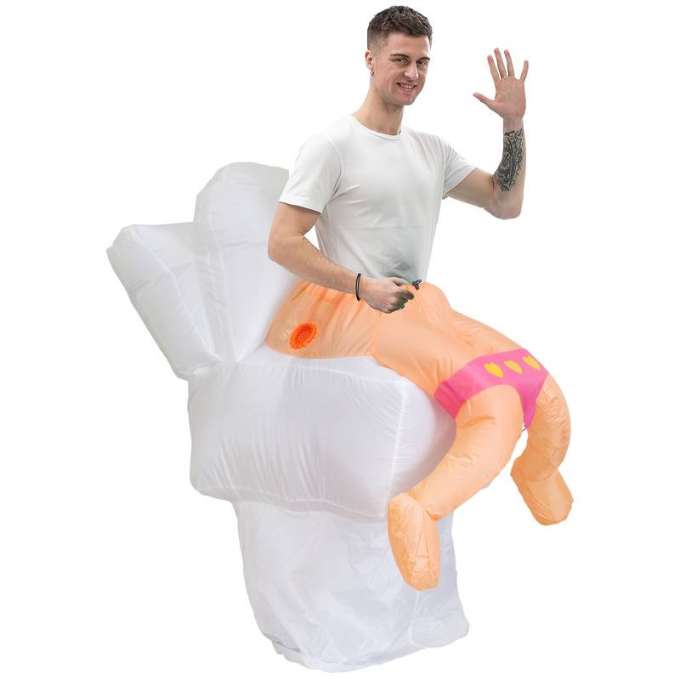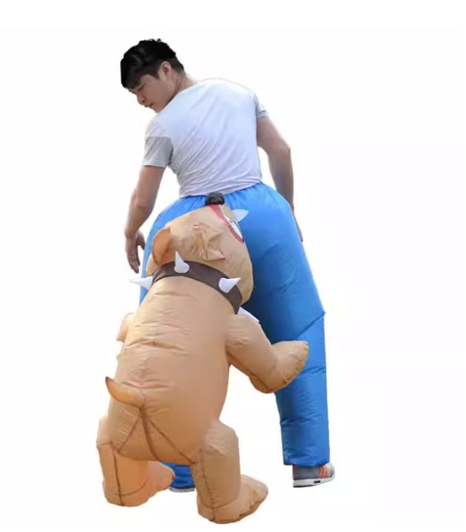 Introducing the 'Bark, Bite, & Inflate Delight!' Blue inflatable pants, because subtlety is overrated. Our attached pooch? He's either got a hankering for some cheeky fun or is just a fan of fresh veggies. Either way, it's a look that screams, 'I'm here to be the life, laugh, and scandal of the party!
