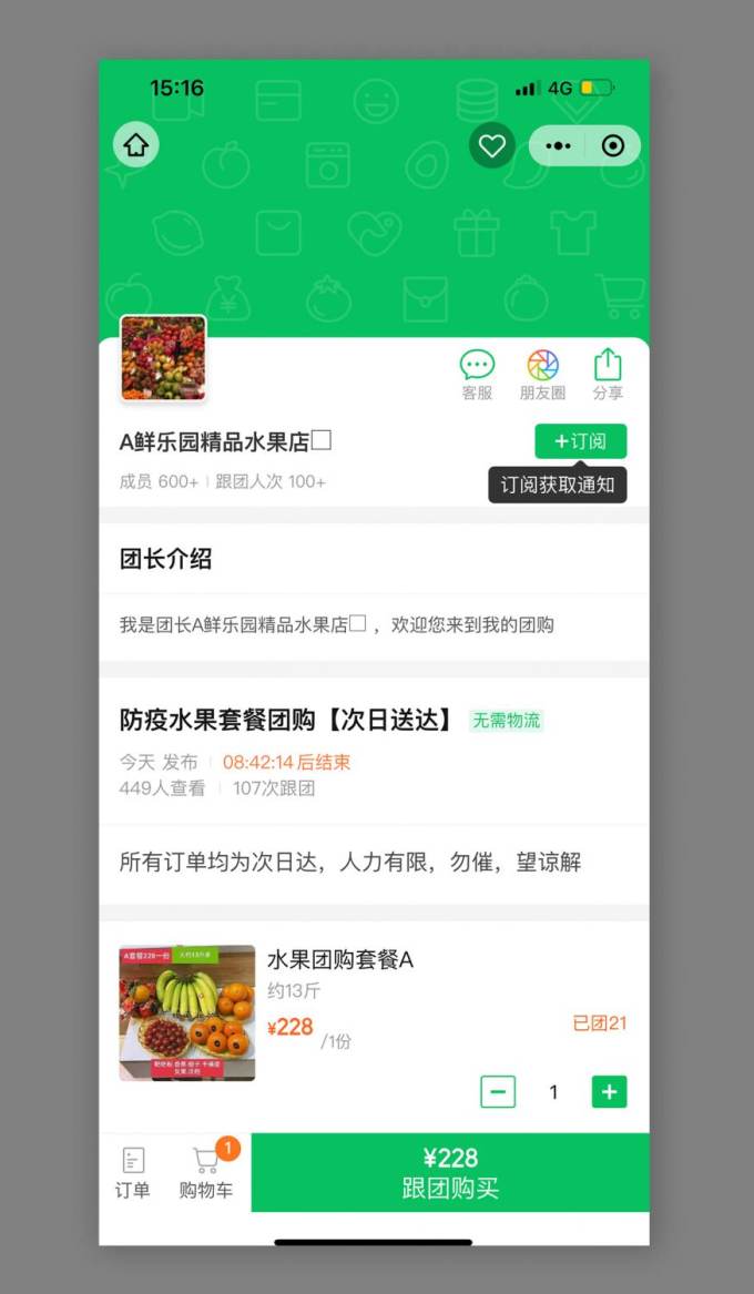 This is the landing page of a group purchase for a 228rmb fruit basket on 快团团.