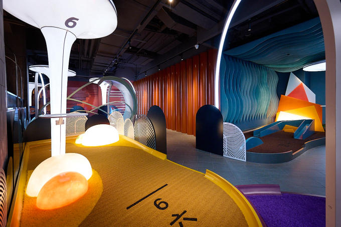 Now we’re talking. The mini golf is a little, half-course dealio with nine holes and a bonus 10th. It’s got a slicker, more minimal, post-modern-ish kind of feel — no campy lawn gnomes or Dutch windmills, but it’s got a nice variety of the classic looping spins, ramps, and bank shots. Fun, little diversion for kids aged 6 and up for an hour or so, for groups of two to four. Design inspiration comes from Chinese calligraphy and Shanghai architecture.
