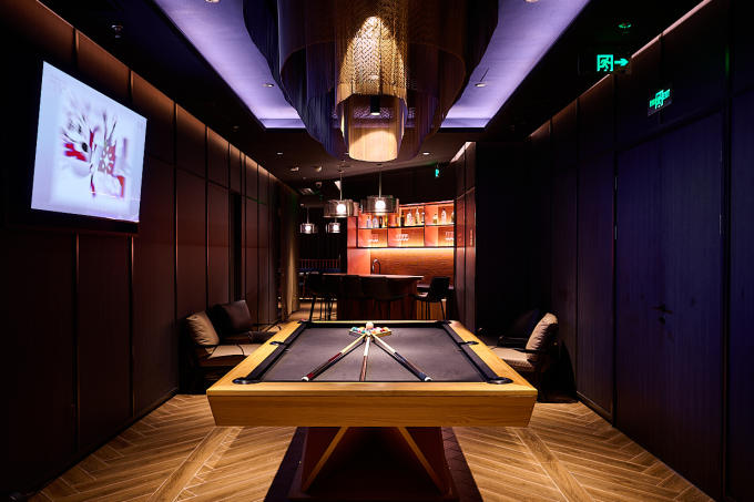 The luxury private room — thats the one with the pool table, pinball, PS5, private bar and bathroom — is 1,288rmb per hour. They can accommodate 30 guests.