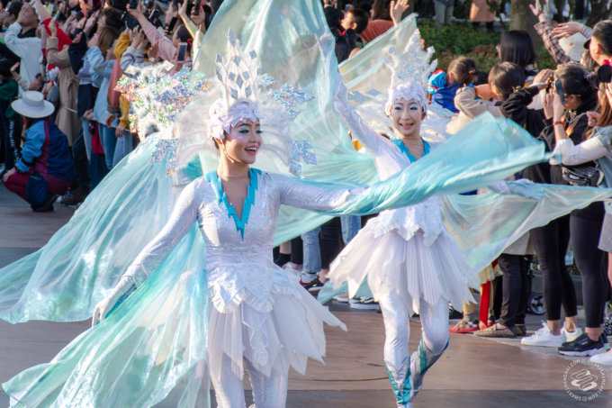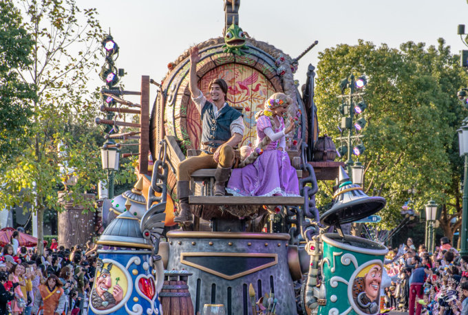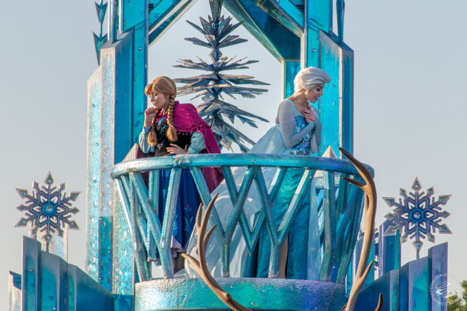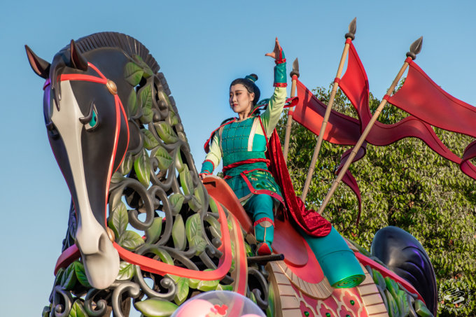 Mulan rocks in on a giant horse like she owns the place, Elsa and Anna repeat sisterly things to each other along the whole track, and Flynn Rider hits on Rapunzel, in public, like the loveable rogue he is. Around their floats are dozens of dancers and characters in costume, from Toy Story's army men to Mulan's soldiery to the Seven Dwarves, who'll run up to high-five spectators lining the routes.