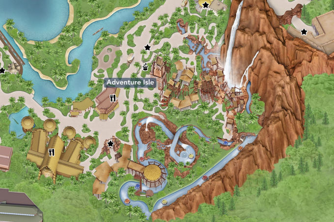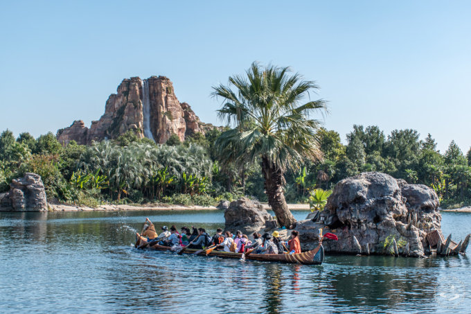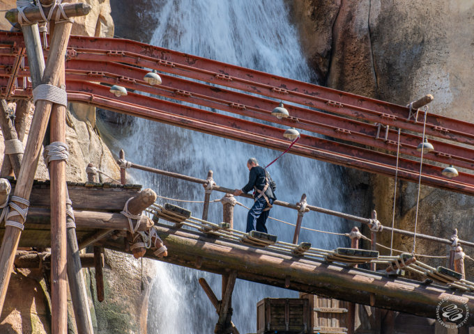 Take a log canoe across the lake and past the pirate galleon, paddling with about 15 other mugs. The primary purpose of this ride seems to be to give photographers something interesting to shoot against the stunning backdrop of the Camp Discovery Adventure Trails waterfall visible in the distance.
