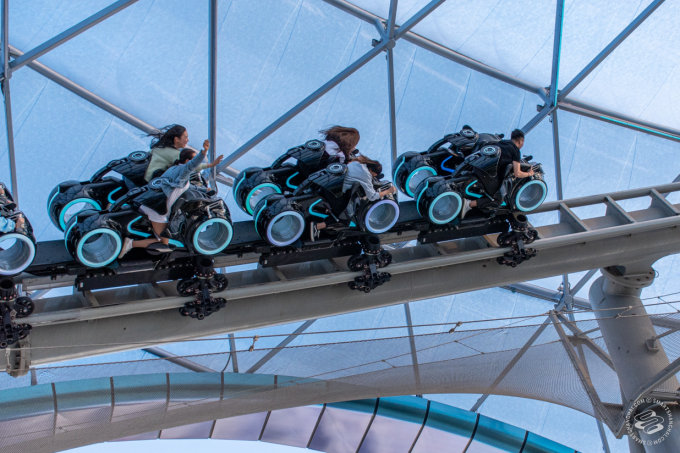 Saving the headline act for last. The TRON Lightcycle Power Run son! This sucker got the most media attention when it first opened with the park in 2016. A roller coaster themed after the TRON movie from 2010, it's Shanghai's answer to Space Mountain. Starting with a drag-race acceleration to 95 km/h that will knock the wind out of your lungs if you're not prepared, it hurls you over the head of before diving inside again to zoom around in the dark with animation and light shows exploding around you. The ride features these motorcycle seats with a plate in your back holding you in place. It's a novel position, even if it mostly affords you a view of someone's ass in front of you, but it can feel a little unnerving the first time around. The second time around, you'll feel comfortable lifting your head up and getting a better view.
