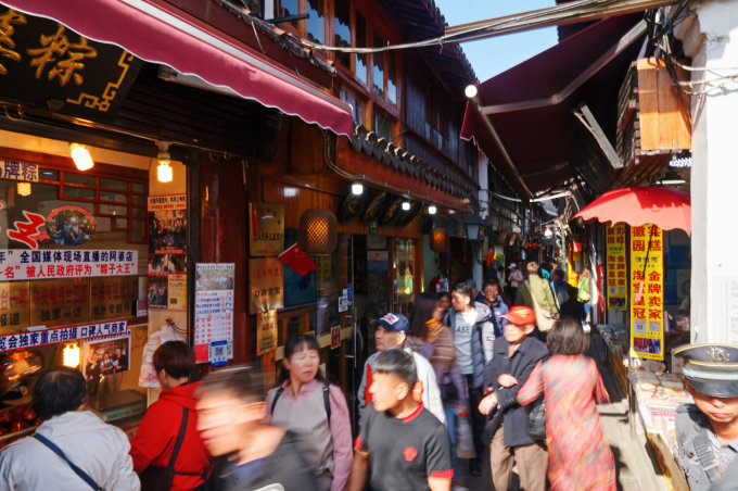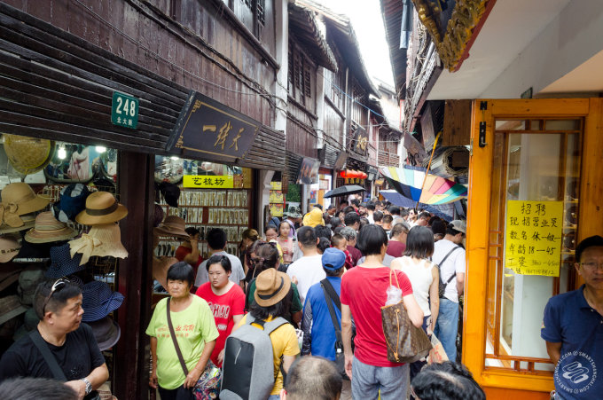 On even a semi-busy day on Zhujiajiao's Bei Dajie and Dongjing Jie, a boiling river of flesh snakes its way through century old streets at a crawl. Hundreds of people crammed in cheek to armpit. Mothers clutching their babes clamber onto the front steps of stores to escape the undulating, Fincher-esque nightmare.