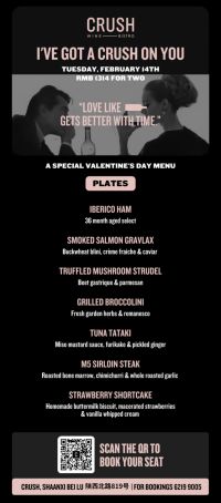 Jing'an's new wine bar that showcases heavily on special dishes found in kitchens around the world (including some highlight dishes in Shanghai that were favorites) is doing a Valentines set for two. This is a classic wine and dine and sixty... well yea, it's a good deal. Hey friends can go together too. Five of their signature dishes, including their bacon wrapped dates stuffed with marcona almonds and stilton cheese (that you will RAVE about). Don't risk it though, call and book your table at 6219 9005. This is going to fill-up with the local Jing'an crowd that loves wine more than they should.