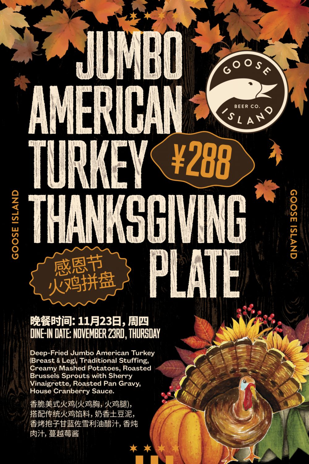 Goose Island ups the ante this Thanksgiving with a feast that's pure American indulgence. For 288rmb, their Jumbo American Turkey Thanksgiving plate is a cornucopia of holiday flavors: deep-fried jumbo American turkey, both breast and leg, nestled alongside traditional stuffing, creamy mashed potatoes, and roasted Brussels sprouts with a tangy sherry vinaigrette. Don't forget the roasted pan gravy and house cranberry sauce to tie it all together. But the feast doesn't stop there. In the run-up to Thanksgiving, Goose Island is also your go-to for Turkeys to-go, starting at 1488rmb, complete with all the fixings. Perfect for those looking to bring the holiday spirit home. Just give them a call for details and bookings. Goose Island, known for its laid-back vibe and love for good beer, is serving up a Thanksgiving that's as hearty and satisfying as their brews. This is more than just a meal; it's a celebration of all things Thanksgiving, Goose Island style.