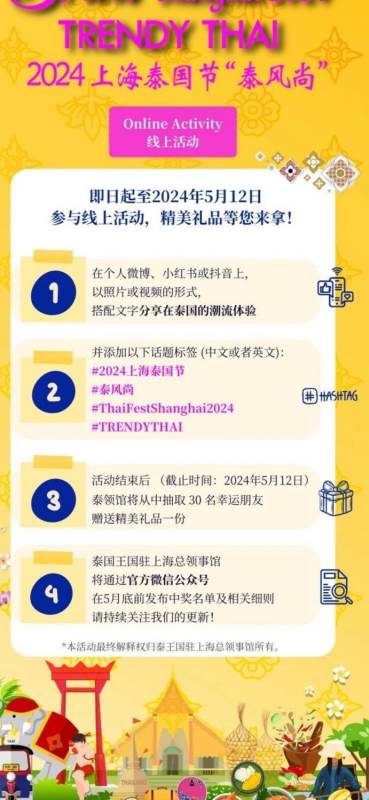 Co-presented by the Consulate General of Thailand in Shanghai, this 3 day long fair is the largest annual Thai cultural event in Shanghai, "demonstrating the attraction and influence of Thai culture from several different perspectives, such as food and beverage, entertainment and sports, leisure experience, clothing and crafts, fashion products, and tourism services. The event will bring together more than 10 Thai restaurants in Shanghai to create classic Thai food, as well as various Thai fruits such as durian with straight hair and Internet celebrity snacks".