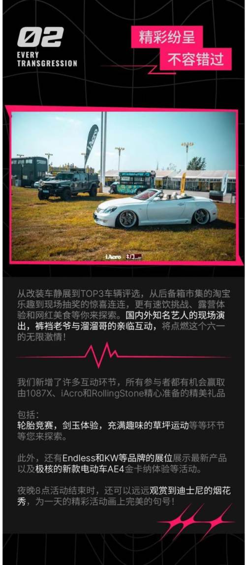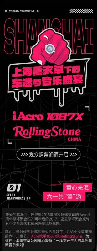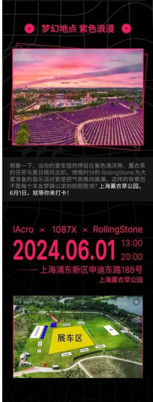 WAVE JAMS is a one-of-a-kind permanent outdoor park experience with MUSIC, NATURE, & RELAXATION presented by Rolling Stone China at Shanghai Lavender Park located within Shanghai Disney properties. Take a stroll. Throw down a blanket. Chill with family and friends. Grab good food and drinks. Enjoy great music. Come and relax during the day and watch a concert. On 1st June, WAVE JAMS, together with iAcro x 1087X, prepared a unique lawn car gathering music party for you in Shanghai Lavender Park! Let's meet friends with cars and share the fun. Not only for the pursuit of speed and passion, but also for the innocent dream and the desire for a better life. Shanghai Lavender Park, looking forward to a purple romantic date with you! This show is from 1pm to 8pm. The ticket is priced at 99 per person.