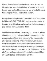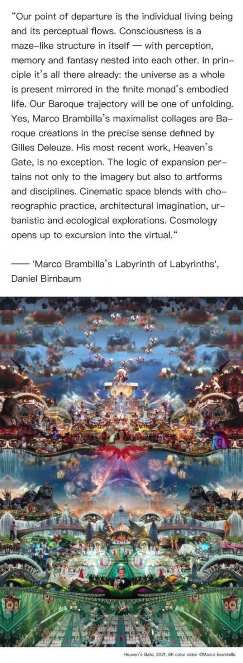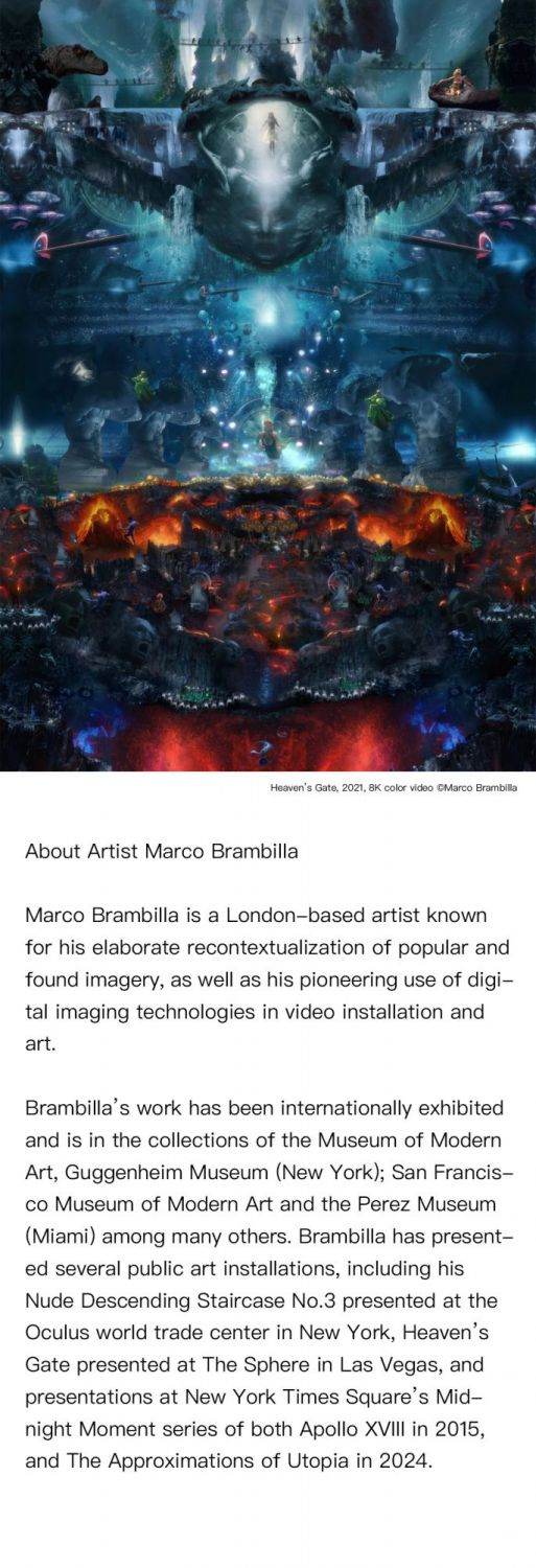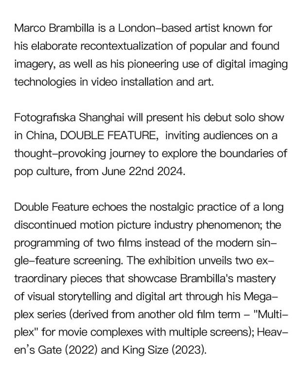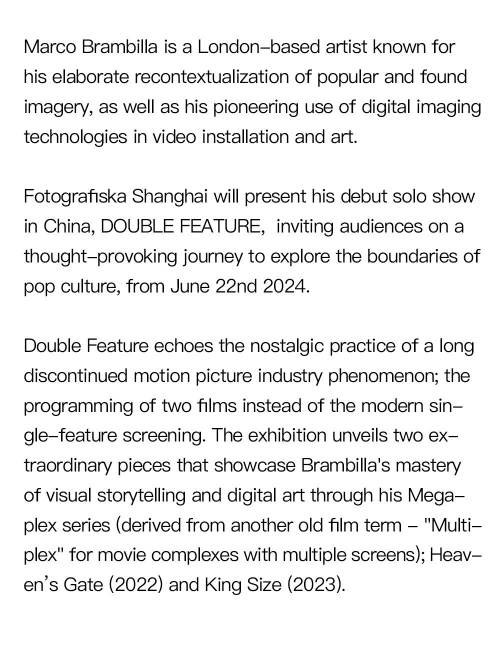 The exhibition Double Feature will present London-based artist Marco Brambilla’s debut solo show in China. It invites audiences on a thought-provoking journey to explore the boundaries of pop culture, from June 22nd, 2024. Marco Brambilla is known for his elaborate recontextualization of popular and found imagery, as well as his pioneering use of digital imaging technologies in video installation and art. Double Feature echoes the nostalgic practice of a long discontinued motion picture industry phenomenon; the programming of two films instead of the modern single-feature screening. The exhibition unveils two extraordinary pieces that showcase Brambilla's mastery of visual storytelling and digital art through his Megaplex series (derived from another old film term - "Multiplex" for movie complexes with multiple screens); Heaven’s Gate (2022) and King Size (2023).