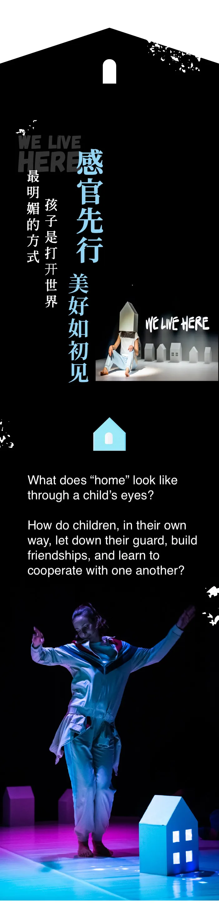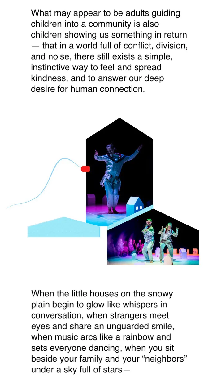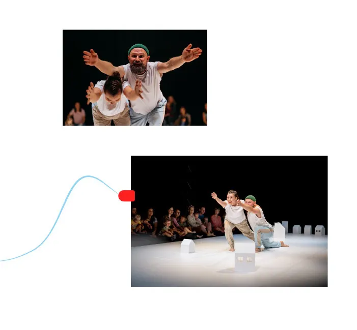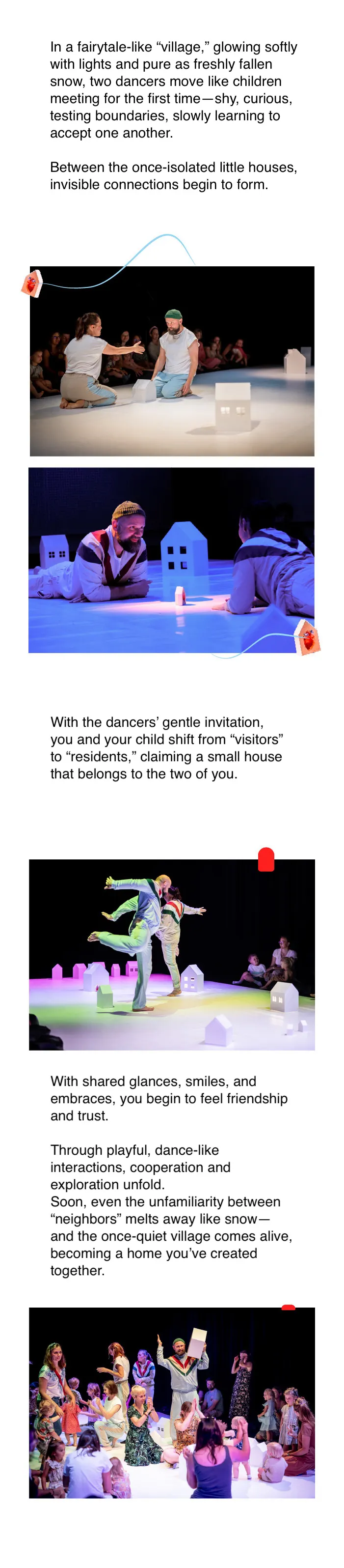 We Live Here is an interactive dance performance designed for children aged 2–6. Young audiences explore a magical village through gentle movement, playful games, and imaginative storytelling alongside professional dancers. The show encourages friendship, trust, and cooperation in a warm, immersive environment.