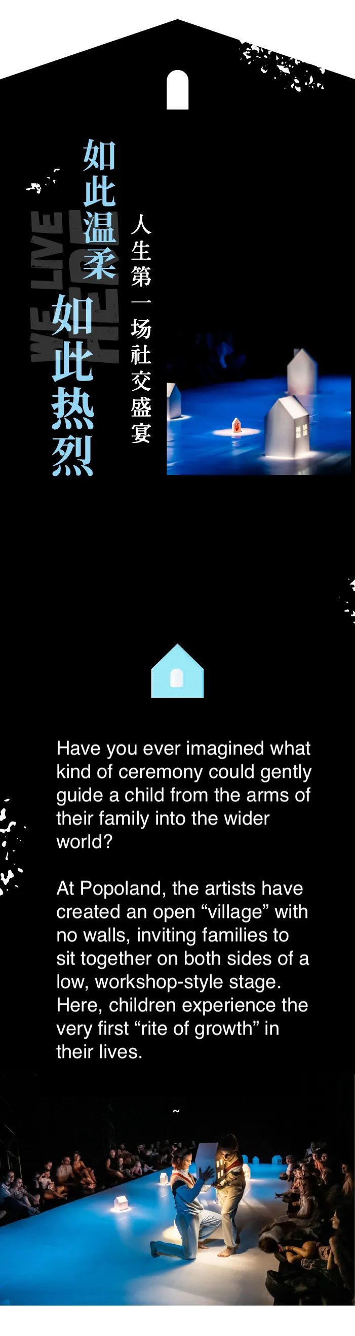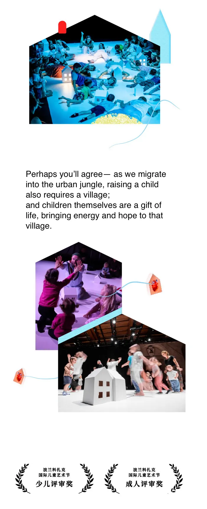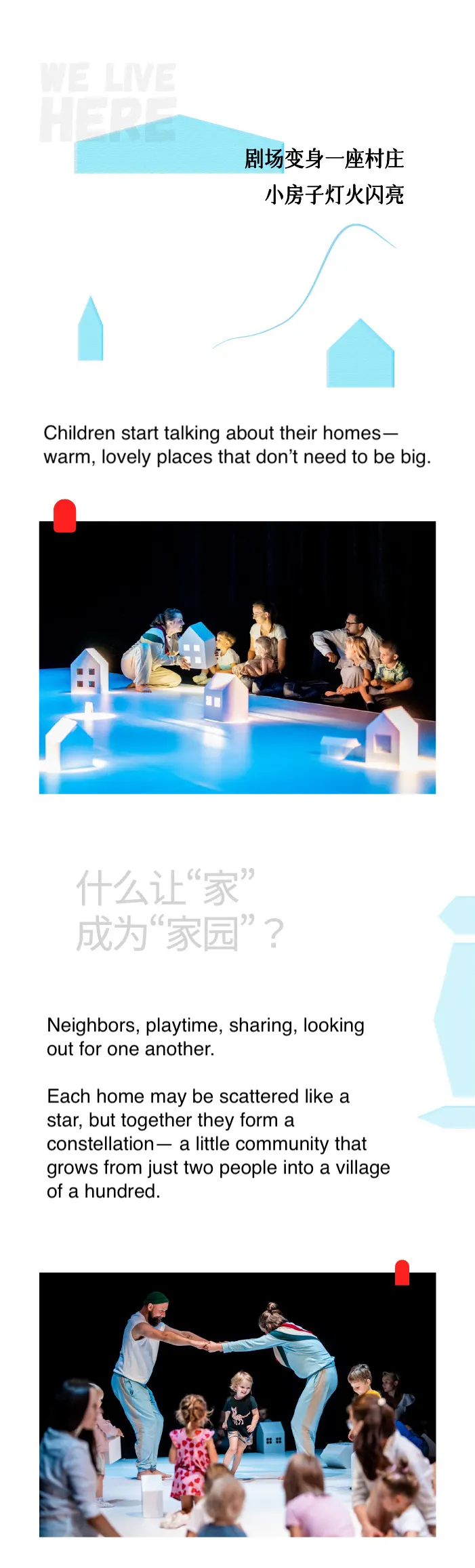 We Live Here is an interactive dance performance designed for children aged 2–6. Young audiences explore a magical village through gentle movement, playful games, and imaginative storytelling alongside professional dancers. The show encourages friendship, trust, and cooperation in a warm, immersive environment.