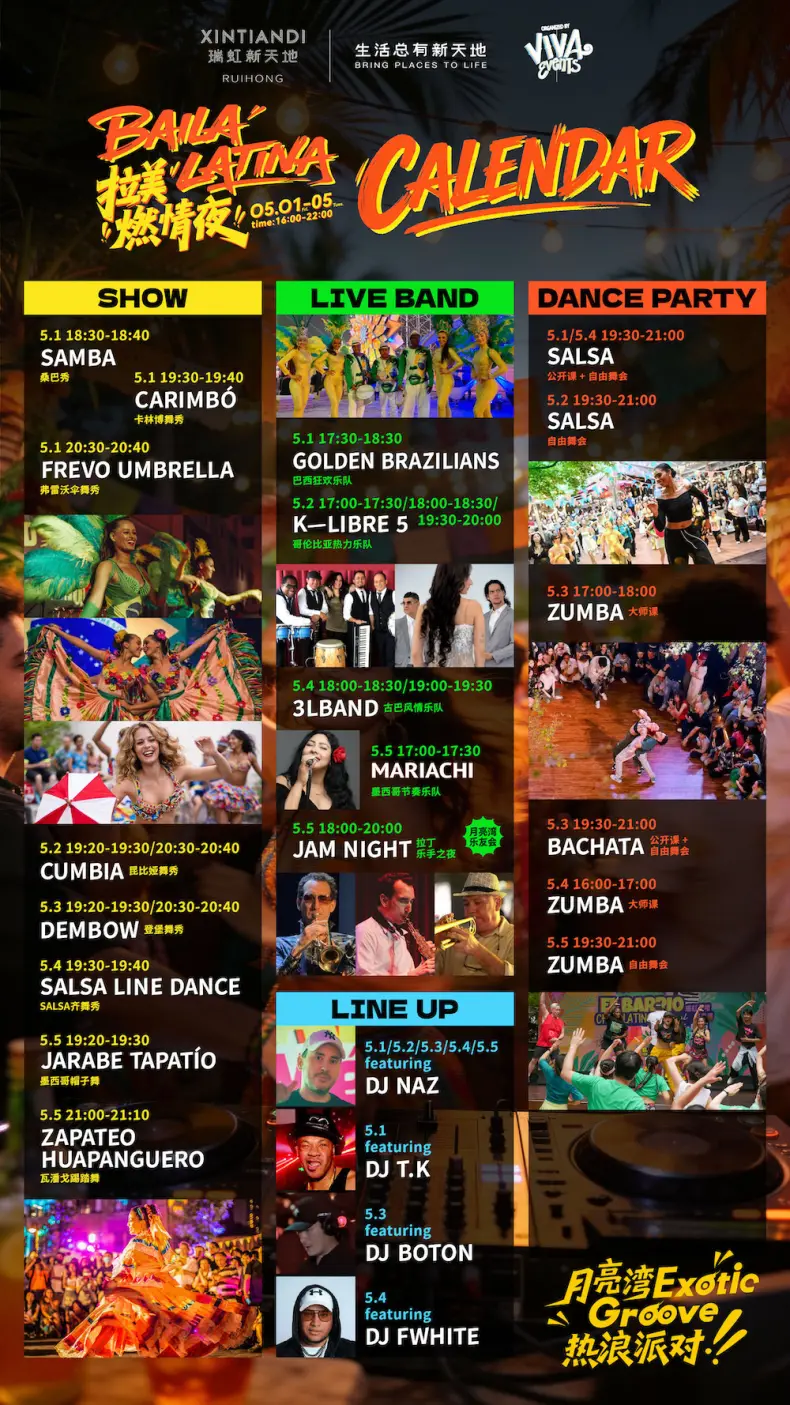 BAILA LATINA Festival brings a multi-day Latin music and food experience to Shanghai, featuring DJs, live performances, and dance styles like salsa, bachata, and reggaeton. With free entry, it combines music, dance, and Latin street food in an open festival setting.
