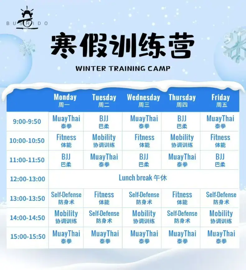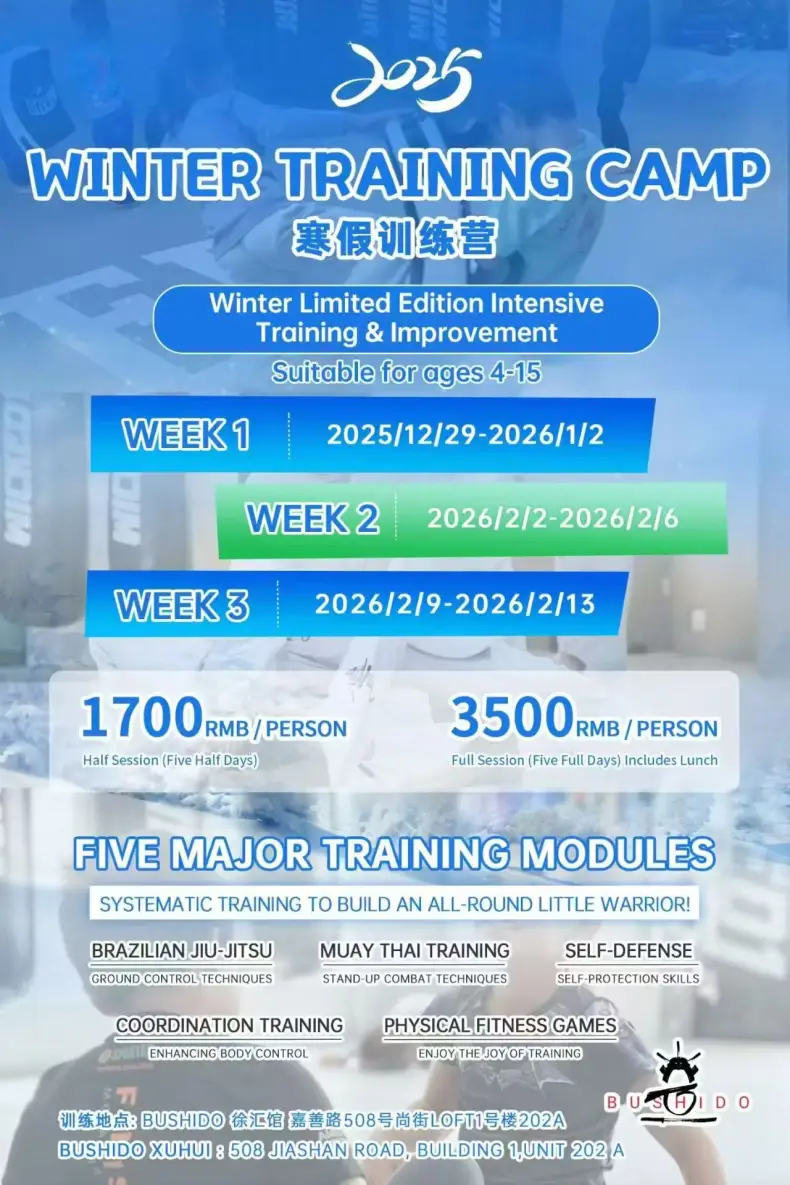 Get your kid moving this winter break with the 2025 Winter Training Camp — a winter-only intensive that’s all about serious skill building and fun for ages 4–15. Running across two blocks, Feb 2–6, and Feb 9–13, this camp comes in two options: Half Session (5 half days) at 1,700rmb or Full Session (5 full days + lunch) at 3,500rmb. Each week mixes five major modules — from Brazilian Jiu-Jitsu ground control and Muay Thai stand-up combat, to self-defense and coordination training, plus physical fitness games — all designed to forge confident, well-rounded little warriors. It’s the perfect way for kids to burn energy, learn real skills, and have a blast over the break.