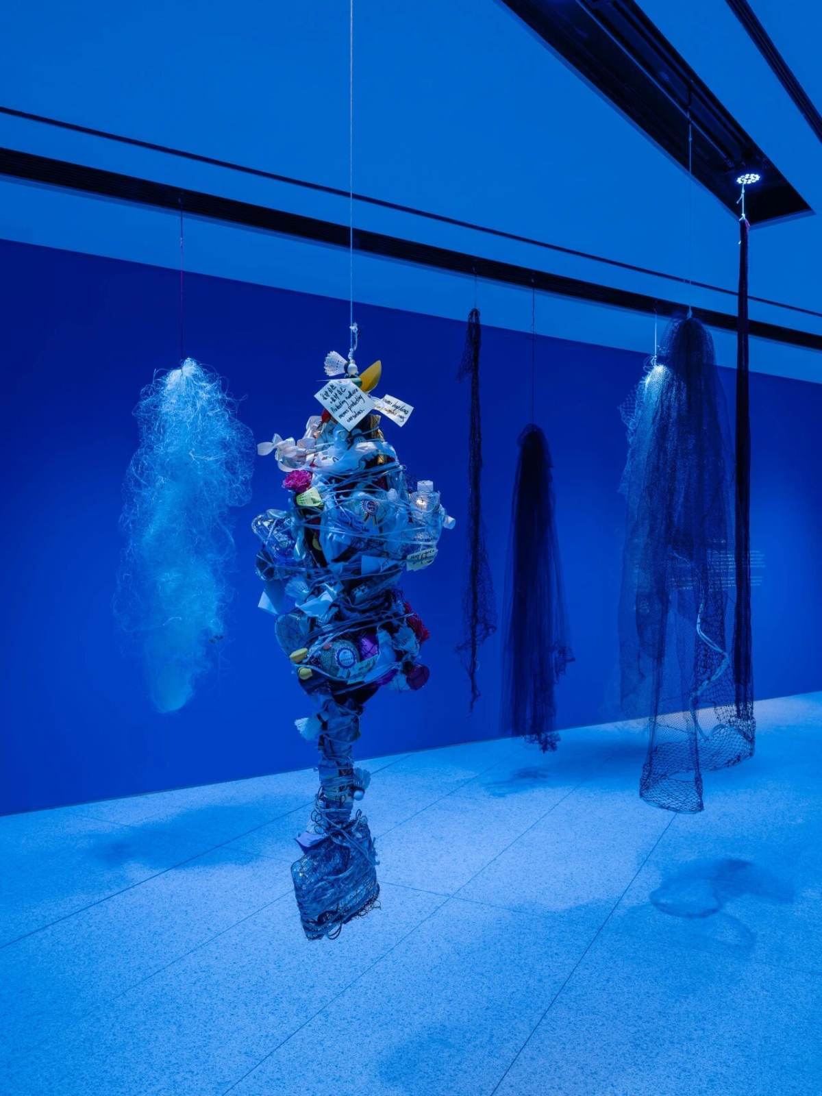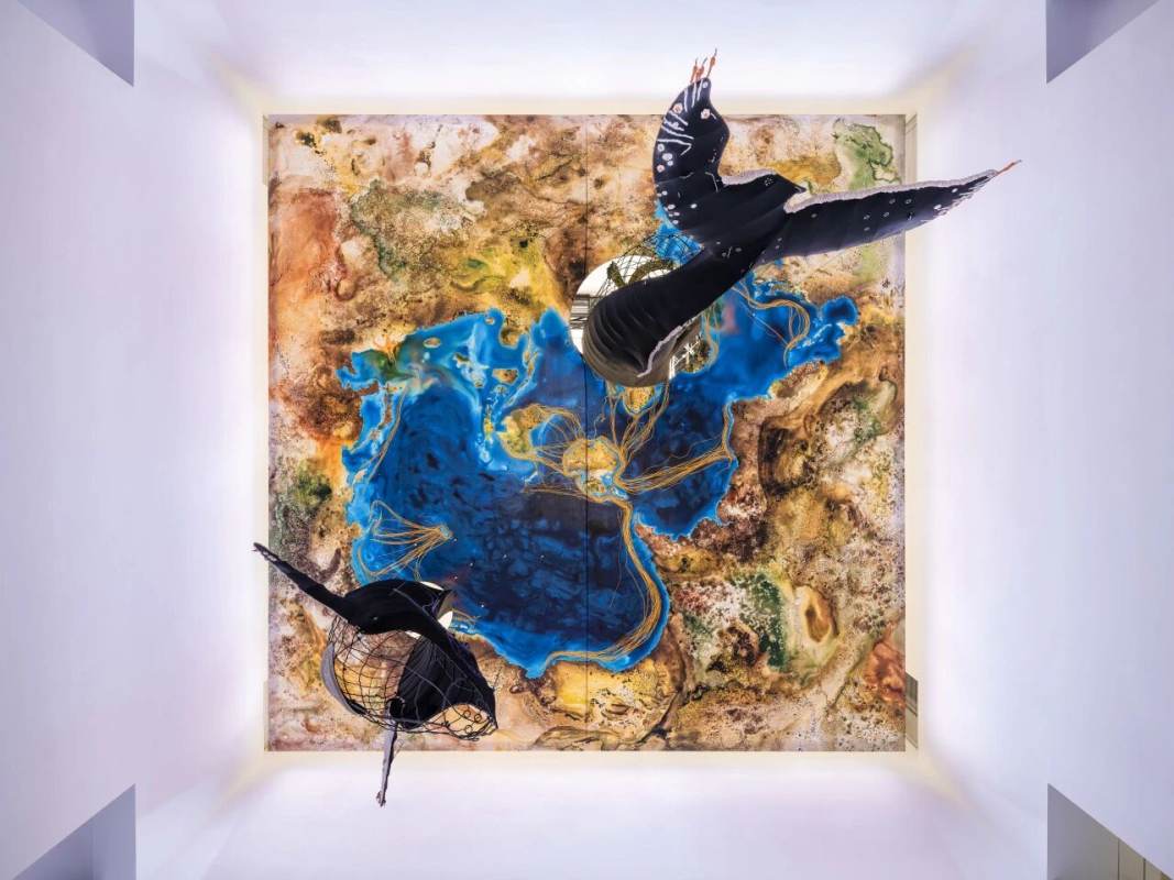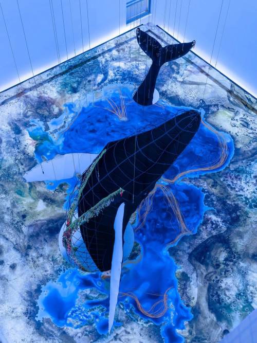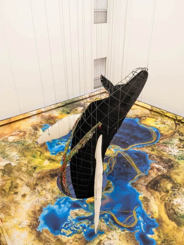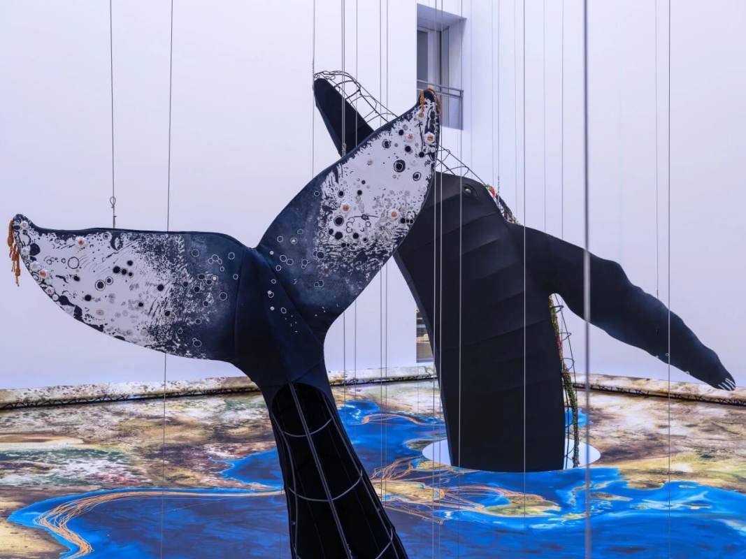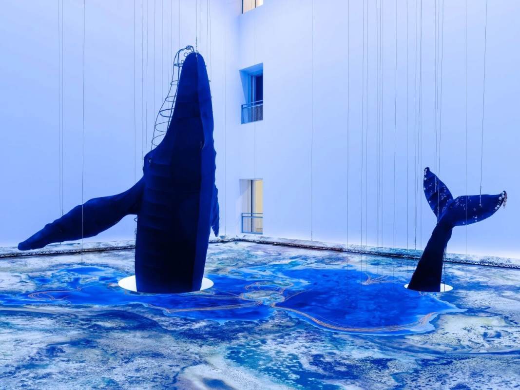 MAP's Central Hall has been transformed into an immersive ocean, featuring two life-size humpback whales, “Batman” and “Aria,” whose bodies show decades of scars, toxins, and memories of life in the Pacific, recreated in intricate detail with embroidery, beads, and fabric. Visitors can explore multiple floors, watch the light shift from midnight blue to daylight, and hear a 22-minute soundscape blending whale calls, underwater ambience, and motorboat hums, making the space feel alive and breathing. Giant maps of whale migration and a co-created “Ghost Net” installation using recycled ocean nets highlight the human impact on the seas, while the hall’s vertical design lets you encounter the whales from every angle. A rare chance to experience the ocean’s beauty, fragility, and life up close, all in one spectacular, immersive setting.