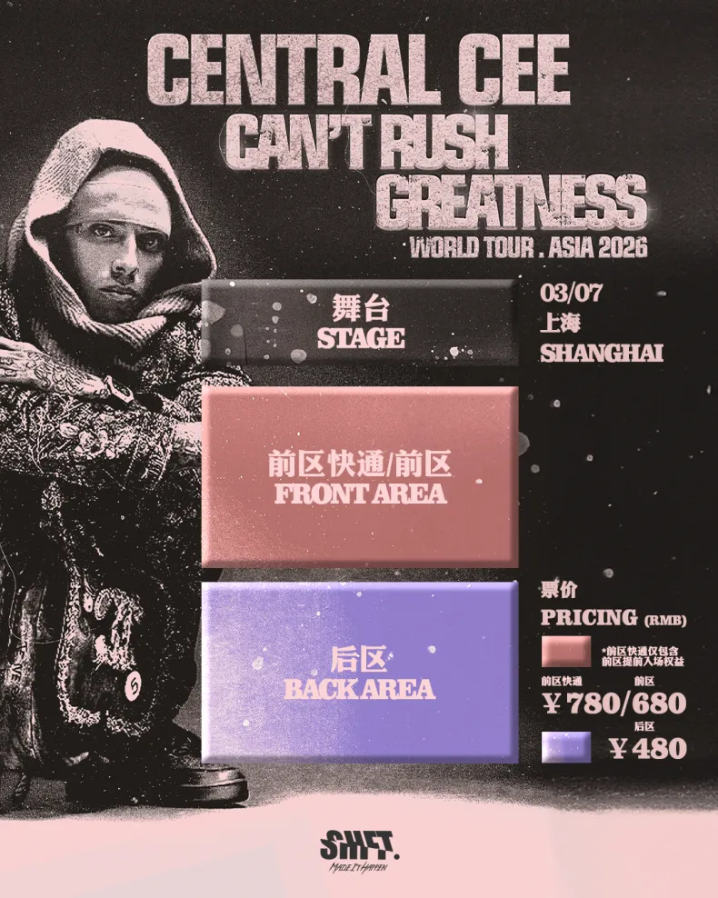 Few UK rappers have crossed over as quickly — or as widely — as Central Cee. Rising out of London’s drill scene, he broke into the global mainstream with tracks like Doja and Let Go, both of which spent serious time on Spotify’s global charts. Since then, his clean delivery and hook-heavy sound have made him one of the most recognizable names in contemporary UK rap, backed by high-profile collaborations and billions of streams worldwide. In March 2026, he brings the Can’t Rush Greatness tour to China, marking a rare chance to catch one of the genre’s biggest current figures live, fresh off an album that further cemented his place at the top of the new generation.