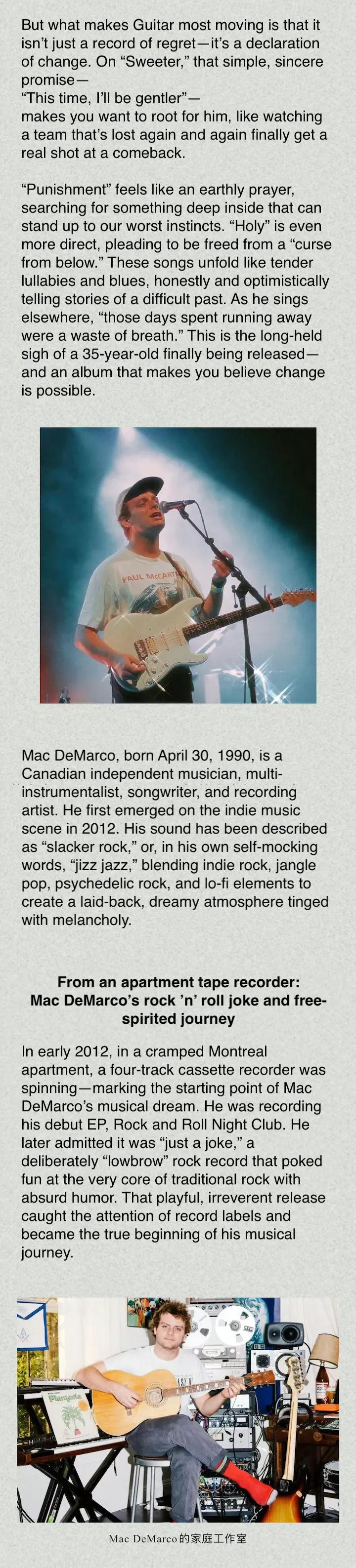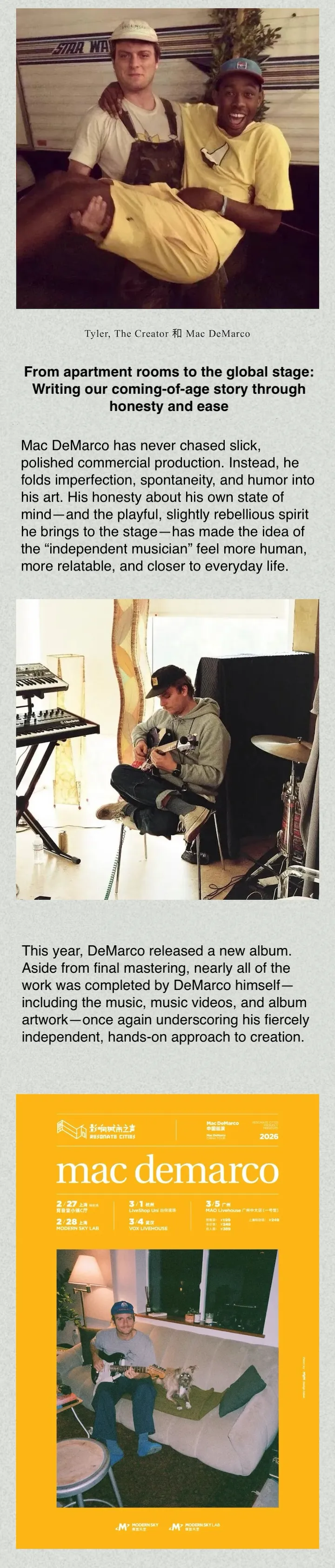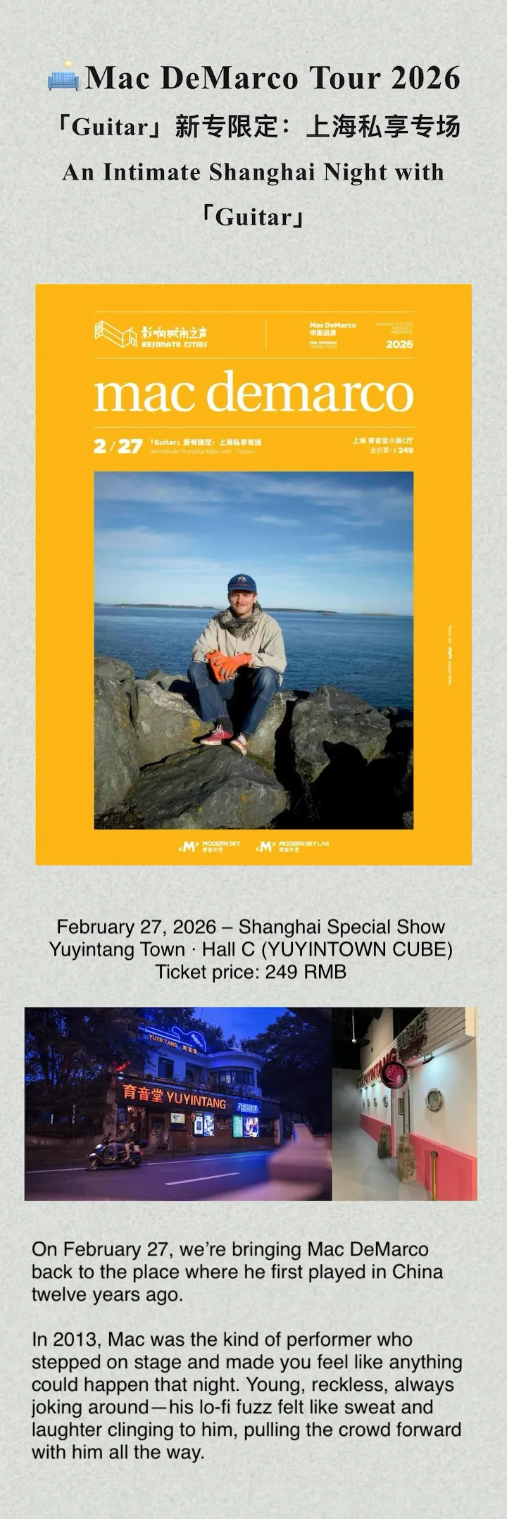 Mac DeMarco is coming back to Shanghai for a special one-night show at YUYINTOWN CUBE. He’ll perform his latest album Guitar in full, along with a selection of classic hits, bringing his intimate, playful, and unfiltered stage presence to the city. Fans can expect a mix of lo-fi charm, humor, and heartfelt moments.